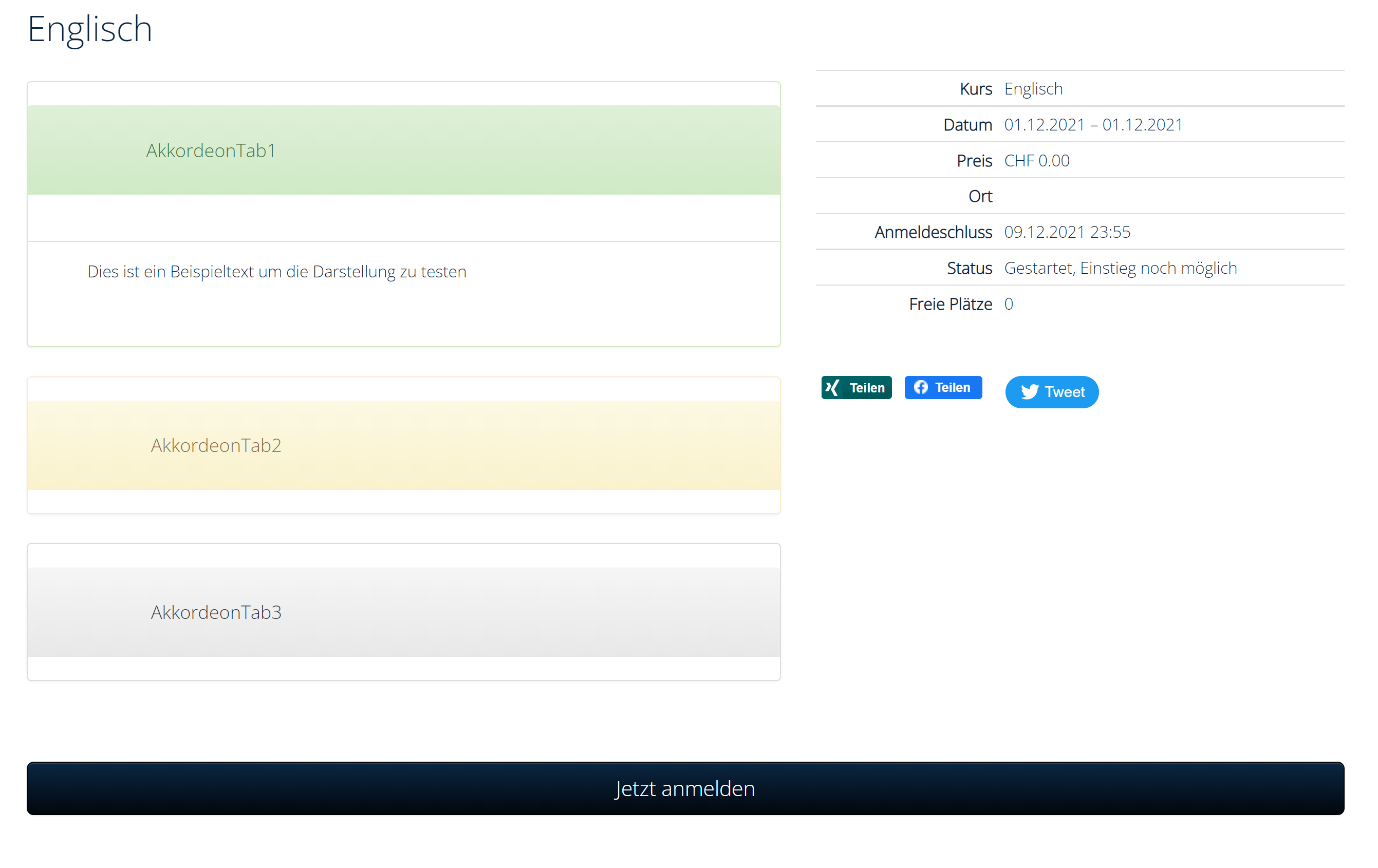 HTML<div class="panel-group" id="accordion" role="tablist" aria-multiselectable="true"> <div class="panel panel-success"> <div class="panel-heading" role="tab" id="headingOne"> <h4 class="panel-title"> <a role="button" data-toggle="collapse" data-parent="#accordion" href="#collapseOne" aria-expanded="true" aria-controls="collapseOne"> AkkordeonTab1 </a> </h4> </div> <div id="collapseOne" class="panel-collapse collapse in" role="tabpanel" aria-labelledby="headingOne"> <div class="panel-body"> Dies ist ein Beispieltext um die Darstellung zu testen </div> </div> </div> <div class="panel panel-warning"> <div class="panel-heading" role="tab" id="headingTwo"> <h4 class="panel-title"> <a class="collapsed" role="button" data-toggle="collapse" data-parent="#accordion" href="#collapseTwo" aria-expanded="false" aria-controls="collapseTwo"> AkkordeonTab2 </a> </h4> </div> <div id="collapseTwo" class="panel-collapse collapse" role="tabpanel" aria-labelledby="headingTwo"> <div class="panel-body"> Dies ist ein Beispieltext um die Darstellung zu testen </div> </div> </div> <div class="panel panel-default"> <div class="panel-heading" role="tab" id="headingThree"> <h4 class="panel-title"> <a class="collapsed" role="button" data-toggle="collapse" data-parent="#accordion" href="#collapseThree" aria-expanded="false" aria-controls="collapseThree"> AkkordeonTab3 </a> </h4> </div> <div id="collapseThree" class="panel-collapse collapse" role="tabpanel" aria-labelledby="headingThree"> <div class="panel-body"> Dies ist ein Beispieltext um die Darstellung zu testen. </div> </div> </div> </div>Anschliessend sollte es in der Beschreibung so aussehen: