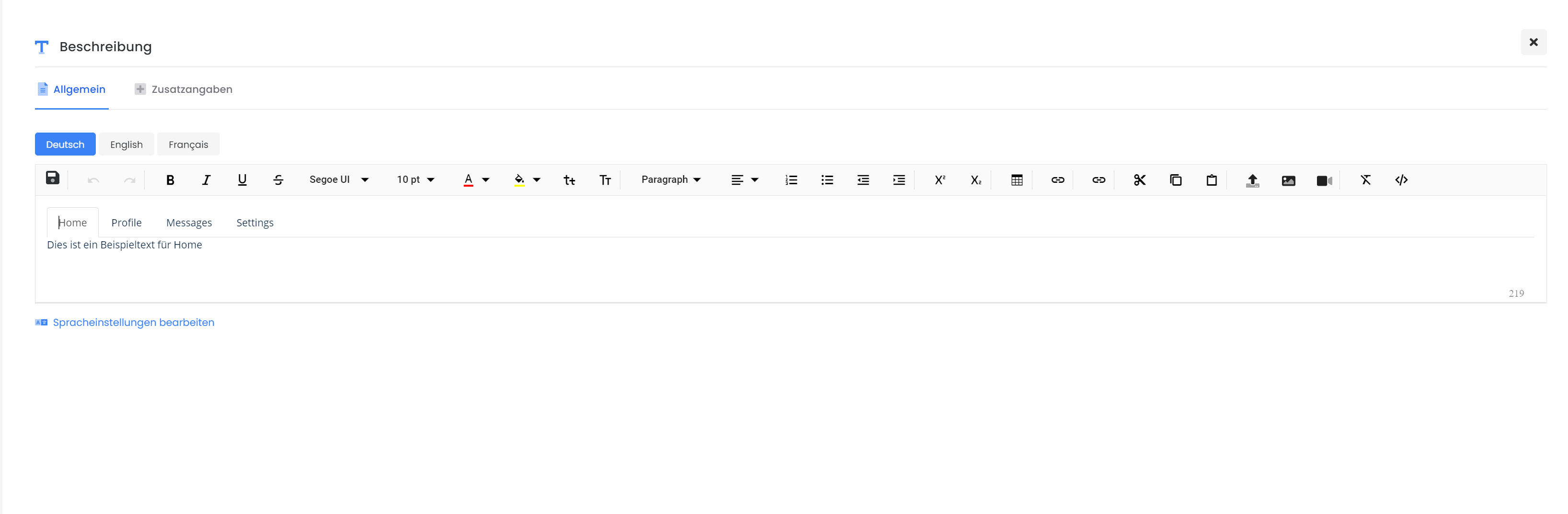 CODE<div> <!-- Nav tabs --> <ul class="nav nav-tabs" role="tablist"> <li role="presentation" class="active"><a href="#home" aria-controls="home" role="tab" data-toggle="tab">Home</a></li> <li role="presentation"><a href="#profile" aria-controls="profile" role="tab" data-toggle="tab">Profile</a></li> <li role="presentation"><a href="#messages" aria-controls="messages" role="tab" data-toggle="tab">Messages</a></li> <li role="presentation"><a href="#settings" aria-controls="settings" role="tab" data-toggle="tab">Settings</a></li> </ul> <!-- Tab panes --> <div class="tab-content"> <div role="tabpanel" class="tab-pane active" id="home">Dies ist ein Beispieltext für Home</div> <div role="tabpanel" class="tab-pane" id="profile">Dies ist ein Beispieltext für Profile</div> <div role="tabpanel" class="tab-pane" id="messages">Dies ist ein Beispieltext für Messages</div> <div role="tabpanel" class="tab-pane" id="settings">Dies ist ein Beispieltext für Settings</div> </div> </div>Anschliessend sollte es in der Beschreibung so aussehen: