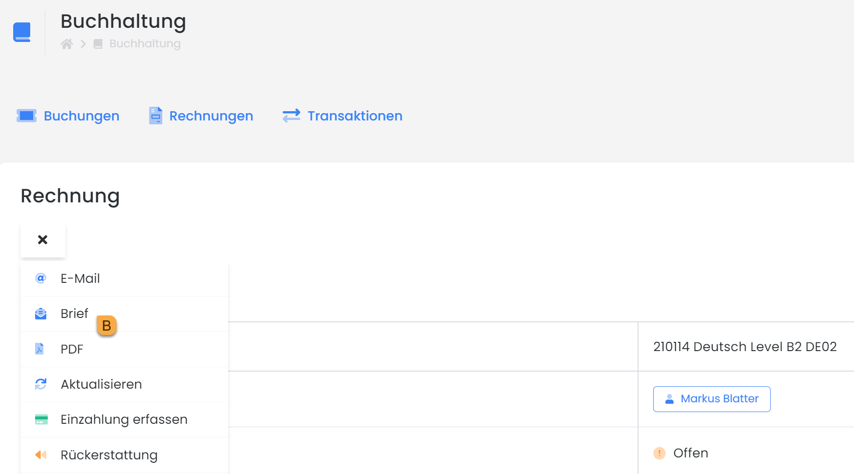 Mit der Funktion Rechnung-Brief können Sie diese per Post versenden lassen. Gehen Sie dazu auf den gewünschten «Teilnehmer» und klicken Sie auf die «Rechnung/en»A.