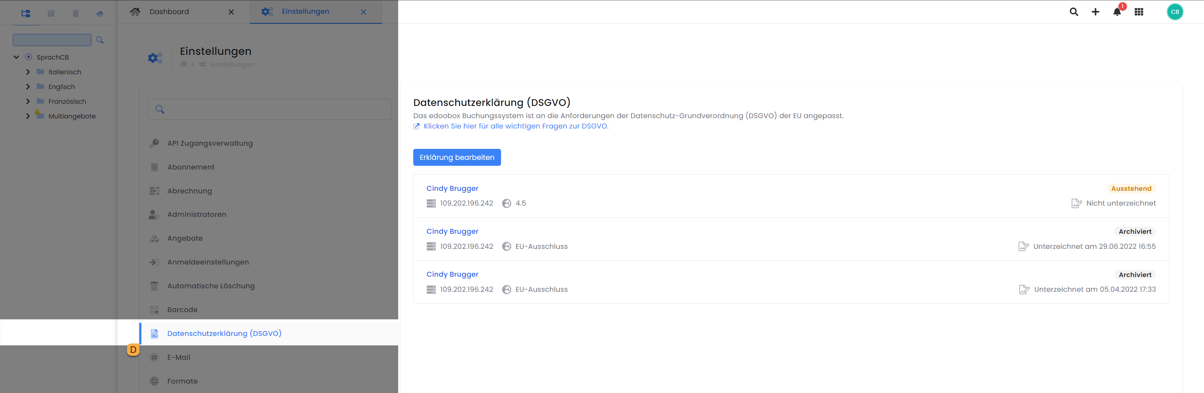 Ebenfalls finden Sie hier in den edoobox Einstellungen den Auftragsdatenverarbeitungsvertrag für die Datenschutz-Grundverordnung. Diese kann hier gleich geprüft und online signiert werden.