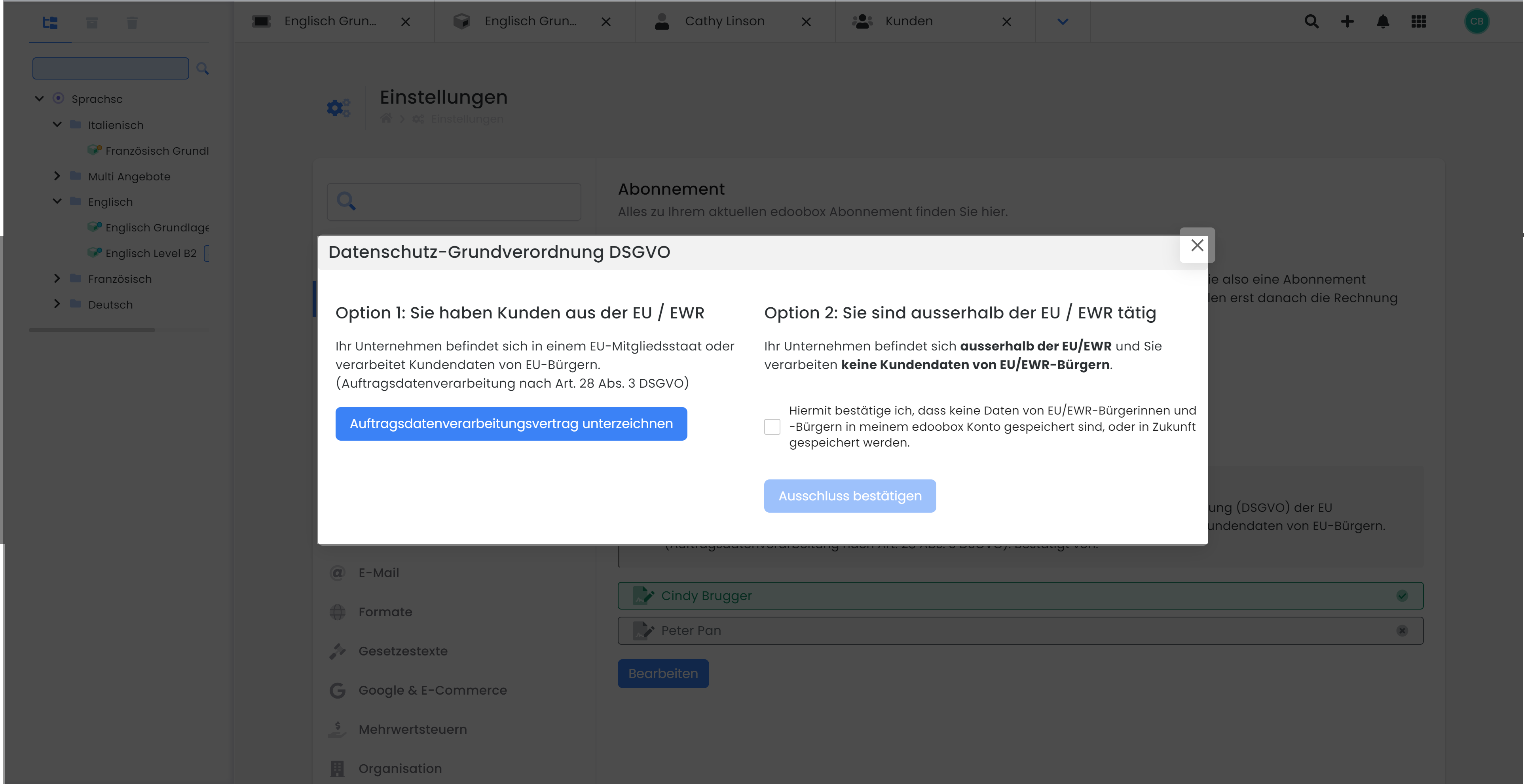edoobox ist DSGVO konform. Unterzeichnen Sie hierzu in den Abonnementseinstellungen unter «Bearbeiten»C unseren Auftragsdatenverarbeitungsvertrag mittels digitaler Signatur und legen Sie fest, aus welcher Region Ihr Kundenbereich kommt.