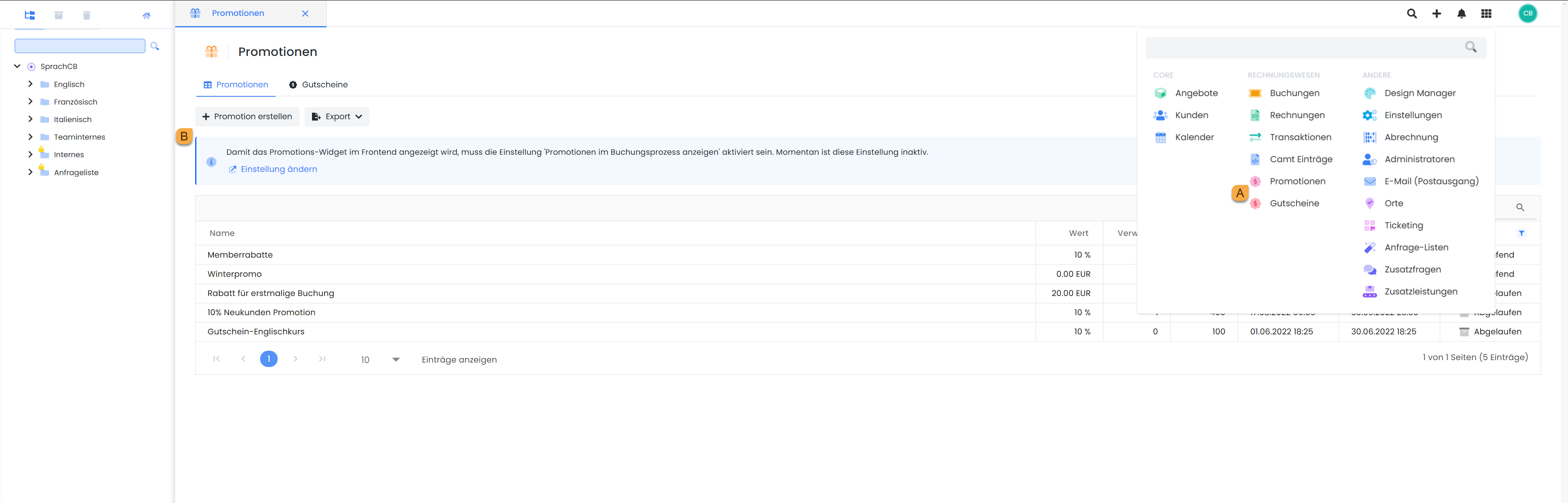 Um eine neue Promotionskampagne zu erstellen, klicken Sie im Appmenü zuerst auf «Promotionen»A. Die Promotionen öffnen sich und mit einem Klick auf den Button «Promotion erstellen» B öffnet sich ein neues Fenster. Hier können Sie mithilfe des Assistenten in 4 Schritten eine neue Promotionskampagne erstellen.