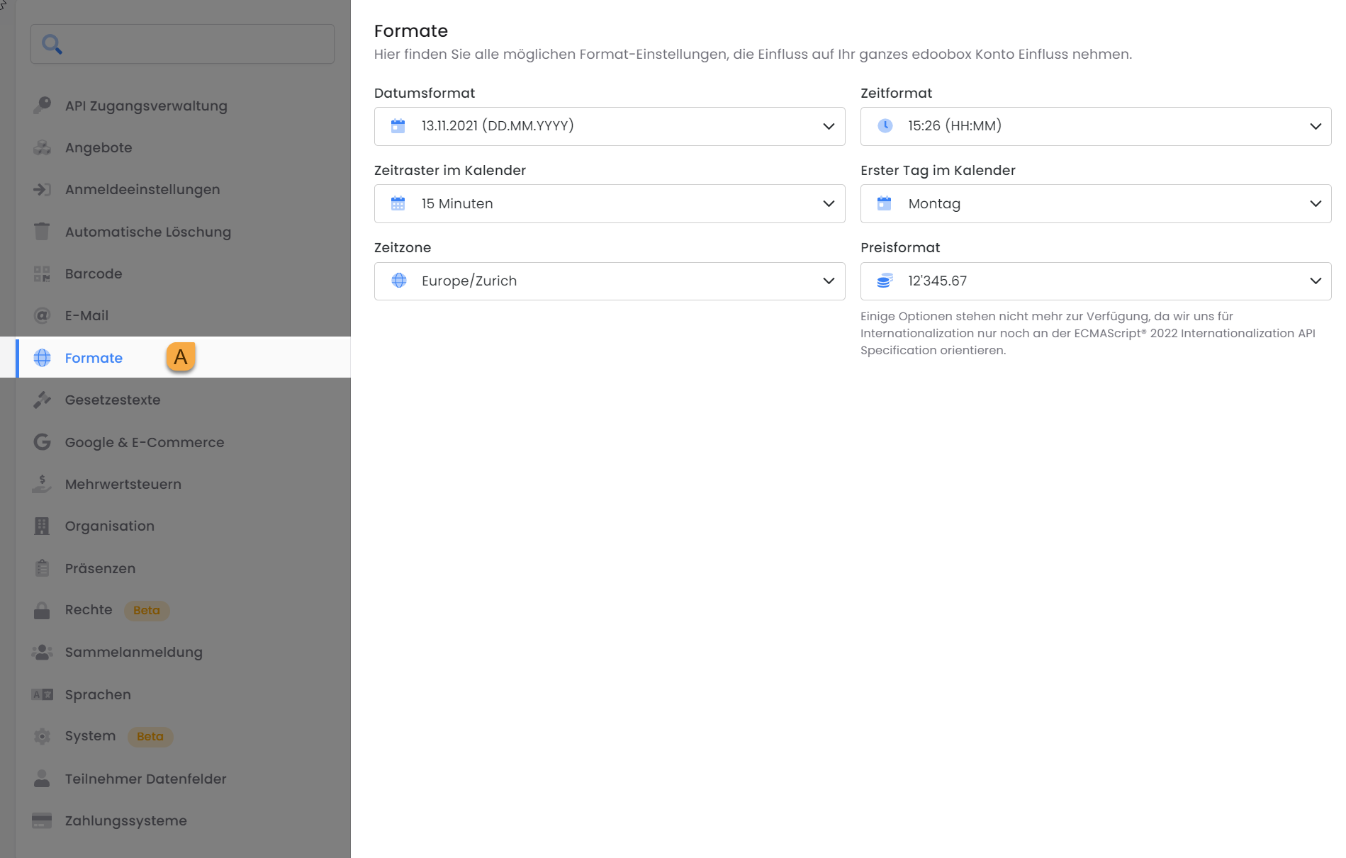 In der Hauptnavigation unter dem Menüpunkt «Einstellungen» können mit einem Klick auf «Formate» A die Datum-, Zeit- und Zahlenformate angepasst werden.