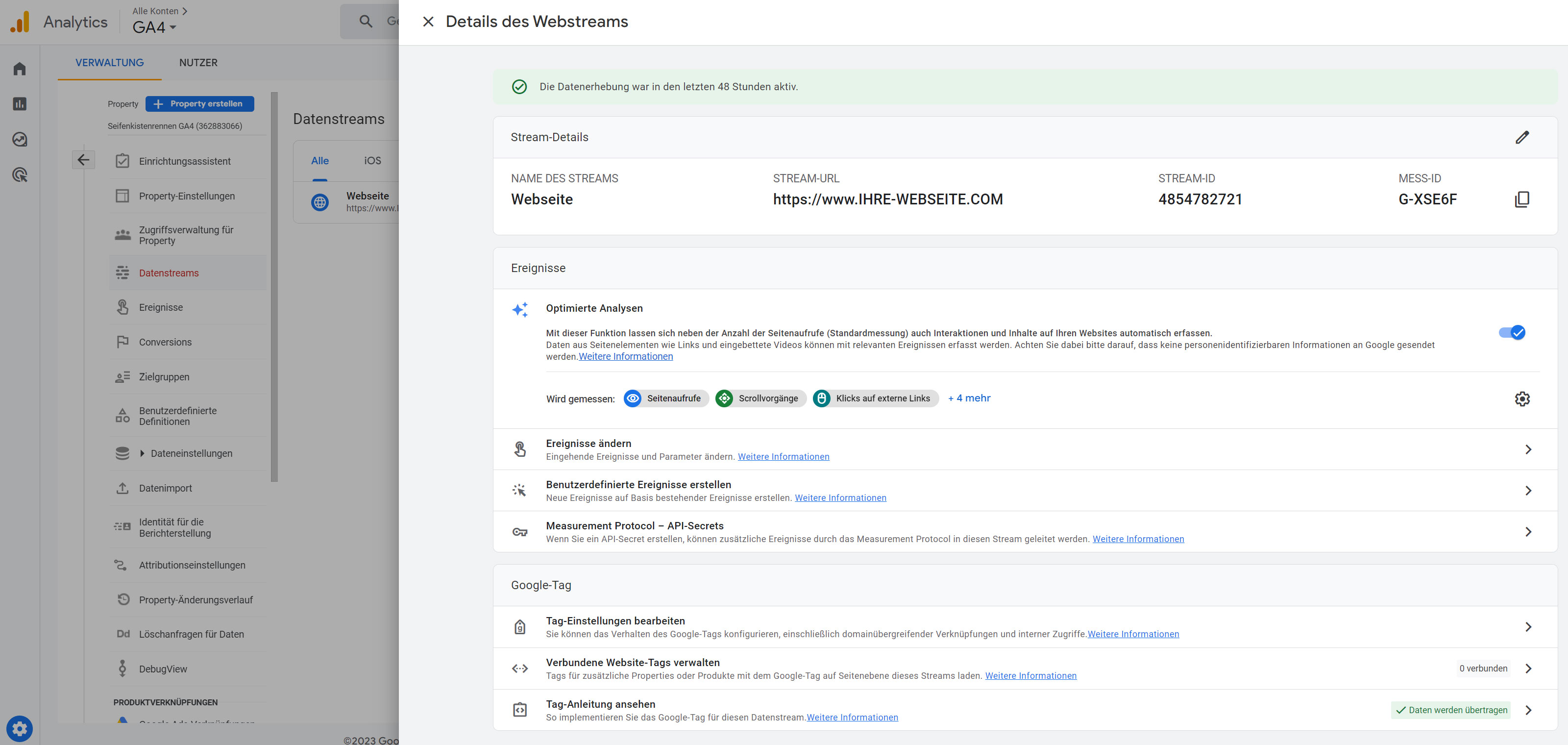 Klicken Sie bei den «Datenstreams» auf «Stream hinzufügen» und erfassen einen neuen Webstream für ihre Webseite, falls dies noch nicht bereits erfasst ist.