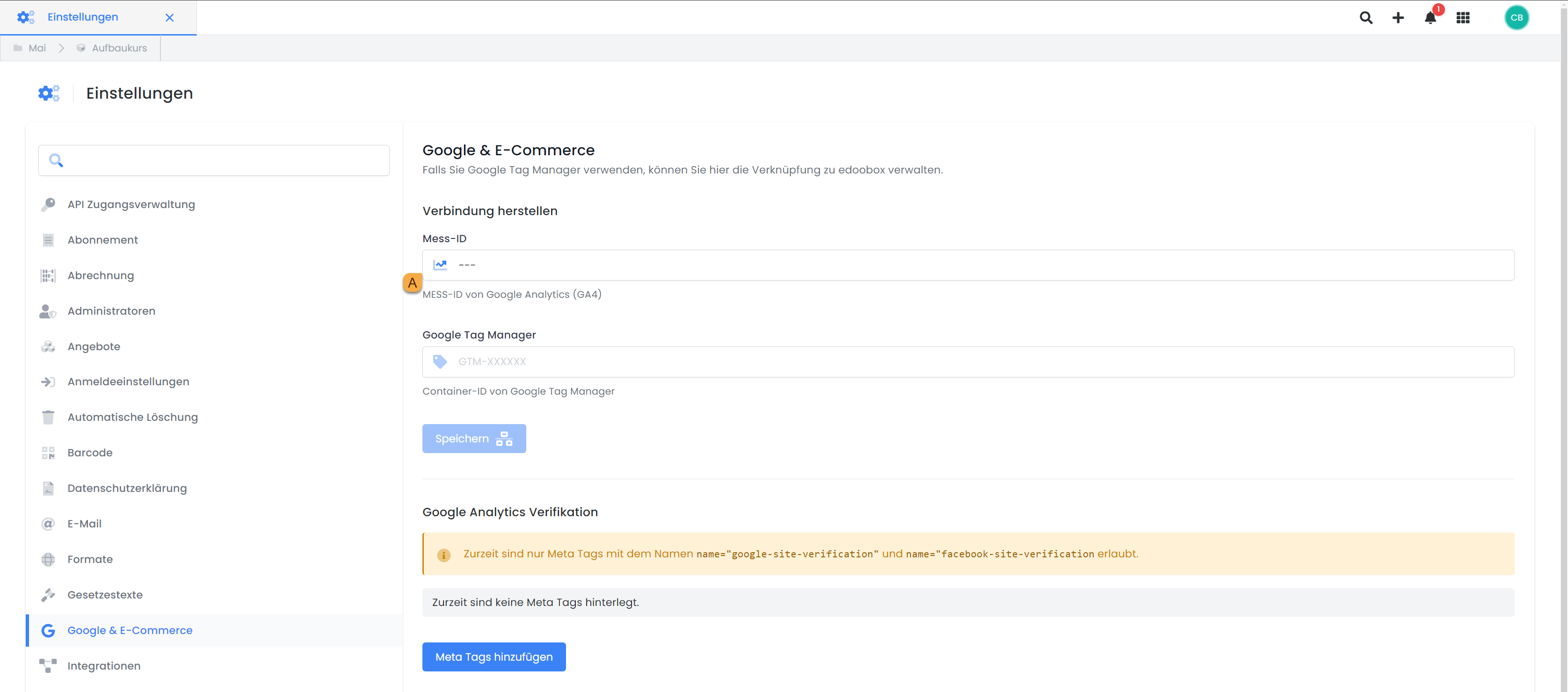 Fügen Sie die Mess-ID in Ihren edoobox-Einstellungen im Bereich «Google & E-Commerce» in das vorgesehene Feld A ein.