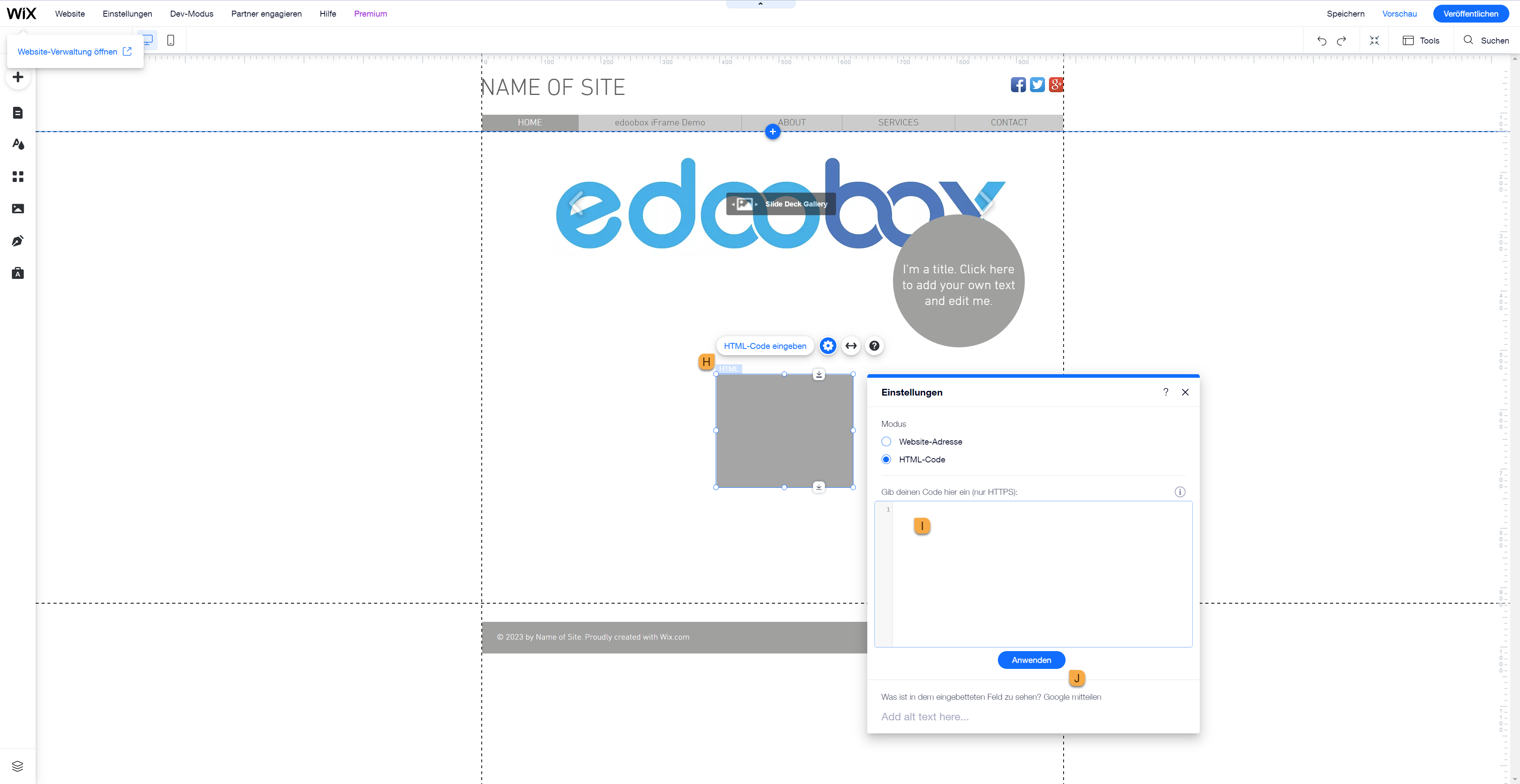 Gehen Sie wieder zurück auf Ihre WIX Seite und klicken auf «HTML-Code eingeben»H. Danach öffnet sich ein Fenster, in welchem Sie den iFrame Code aus der Zwischenablage einfügenI können. Um den Vorgang abzuschliessen, klicken Sie auf «Anwenden»J.
