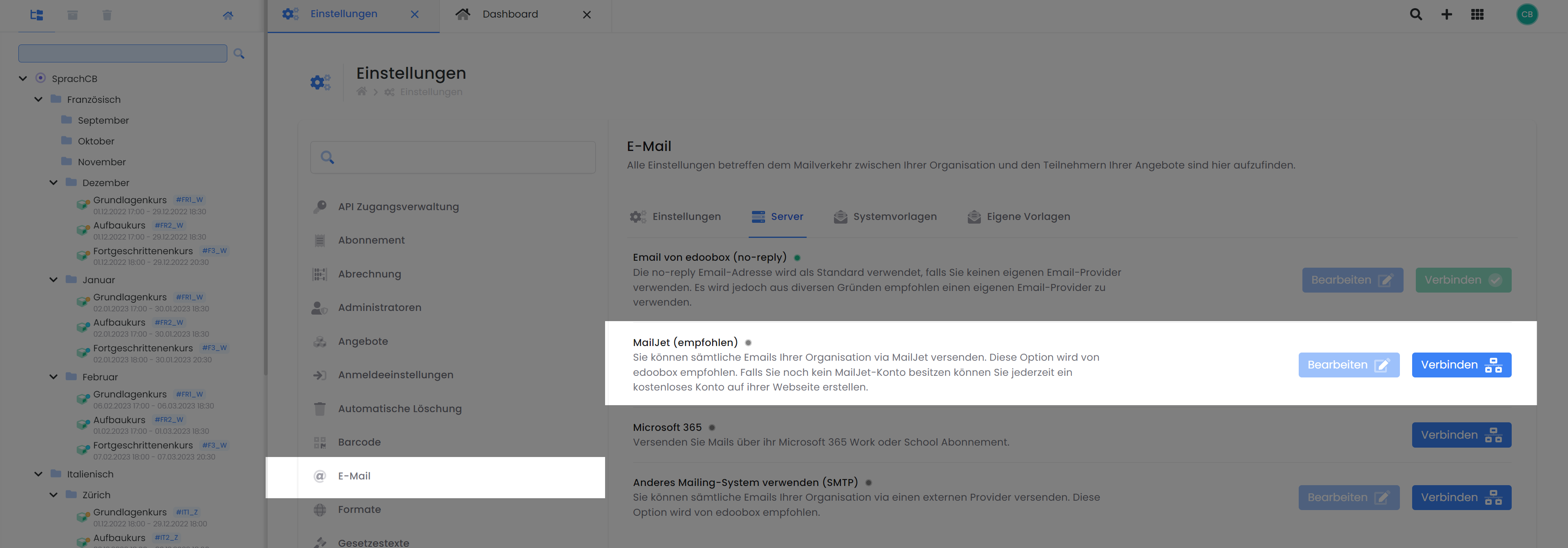 In edoobox können Sie Mailjet unter «Einstellungen» - «E-Mail» im Reiter «Server» im Absatz MailJet (empfohlen) verknüpfen.