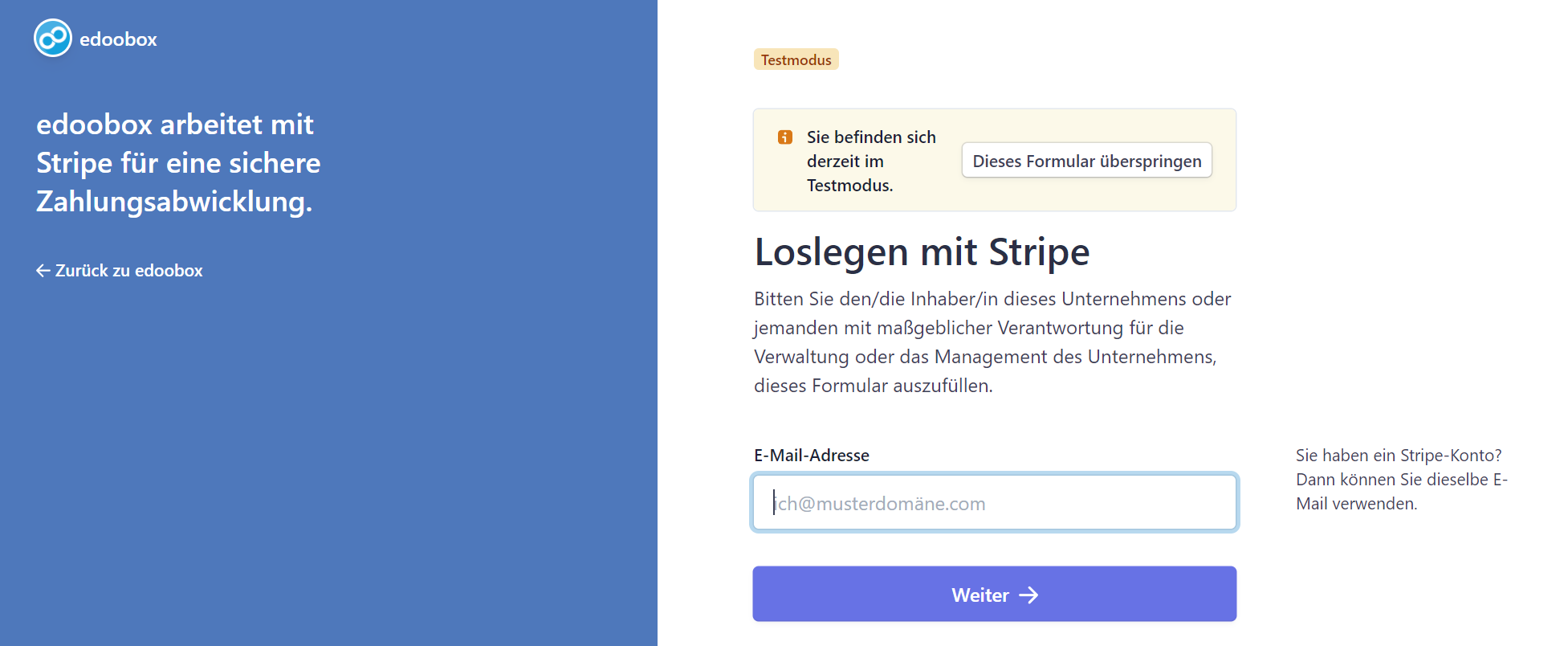 2. Haben Sie bereits ein Konto bei Stripe, können Sie sich mit Ihrer E-Mail-Adresse anmelden. Wenn dies nicht der Fall ist, geben Sie Ihre E-Mail-Adresse an und klicken auf «Weiter».