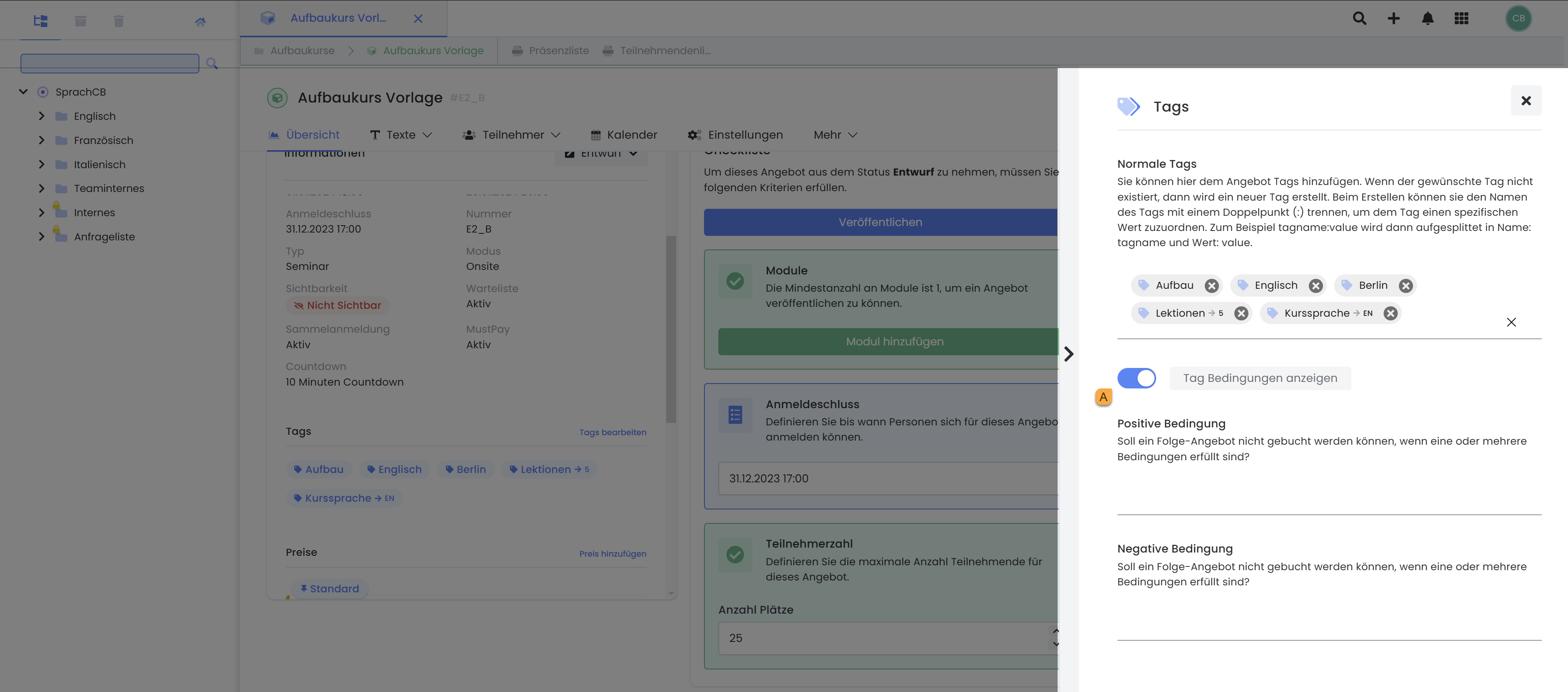Sie haben die Möglichkeit, bei einem Angebot positive Bedingungen zu setzen. Das bedeutet, dass die Buchung eines vorausgesetzten Angebotes zuerst abgeschlossen sein muss, bevor sich ein*e Teilnehmer*in für das aktuelle Angebot anmelden kann. Das ist für Sie interessant, wenn Sie nicht möchten, dass Teilnehmende ohne Vorkenntnisse ein Folgeangebot buchen können.