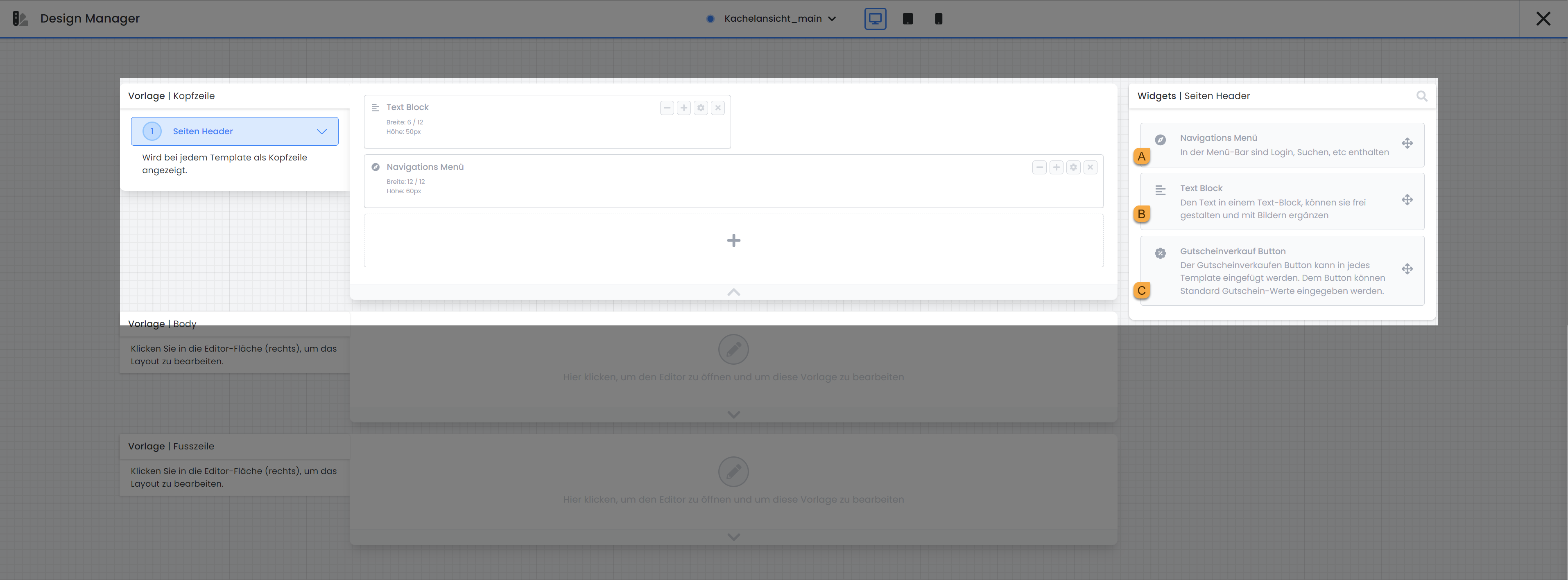 In beiden Vorlagen – sowohl in der Kopf- als auch in der Fusszeile – haben Sie zudem die Option, die Widgets Text Block B und Gutscheinverkauf Button C einzufügen. Der Vorteil der Platzierung des Gutscheinverkauf Buttons in der Kopf- oder Fusszeile liegt darin, dass den Kunden auf jeder Seite des Buchungsprozesses der Gutscheinverkauf angeboten wird, was die Sichtbarkeit und Zugänglichkeit dieses Angebots erhöht.