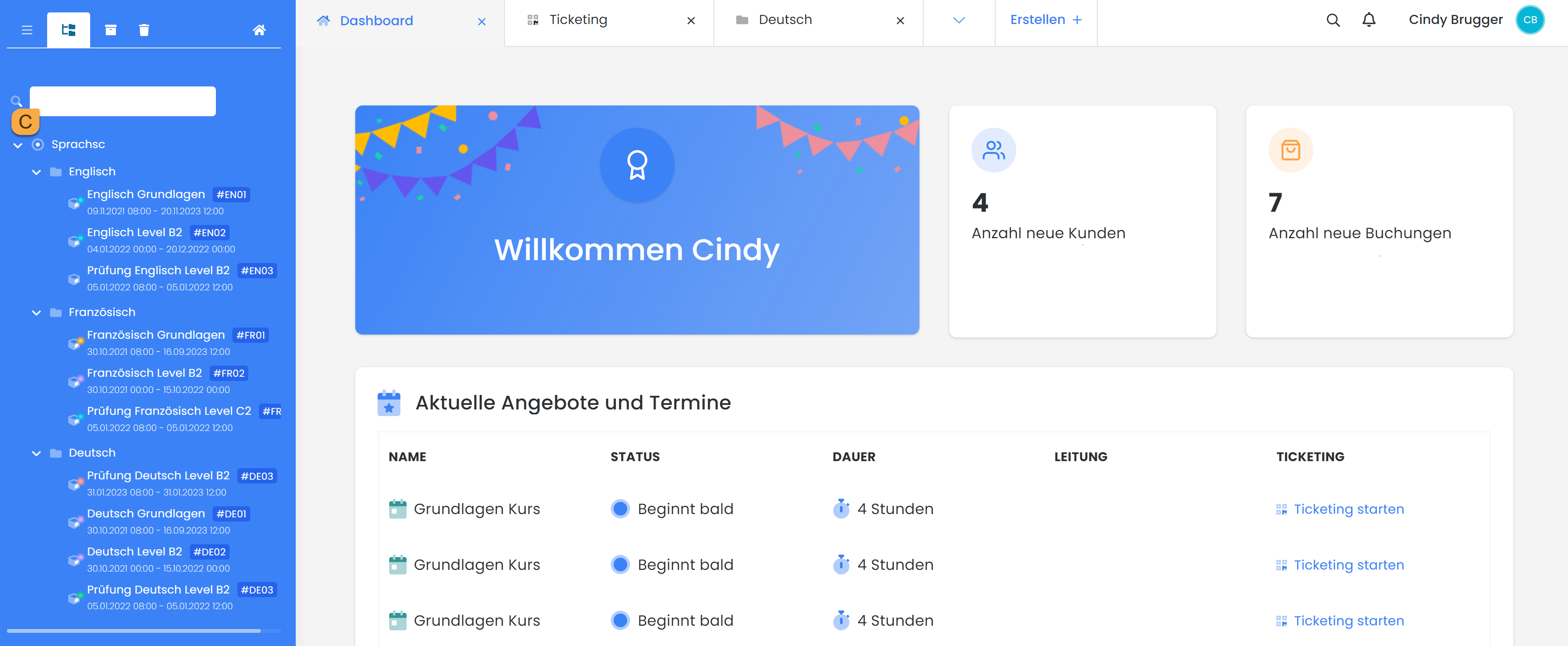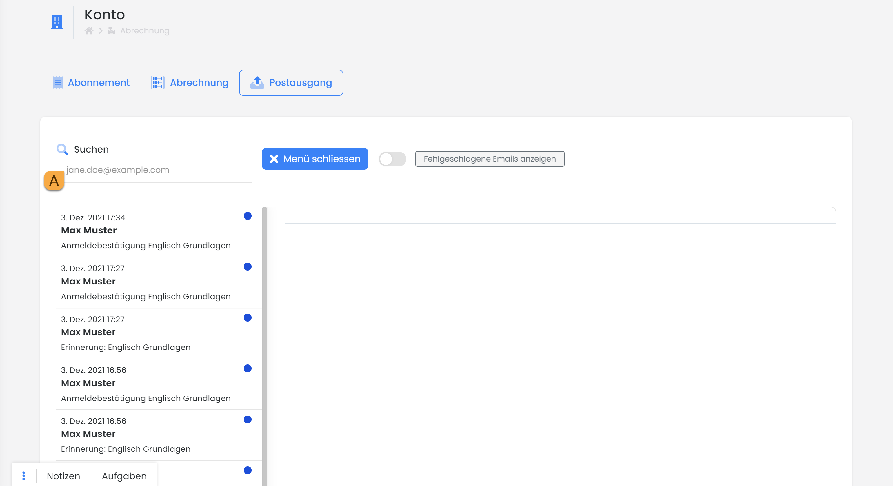 Mit der neu implementierten Suche im allgemeinen Postausgang A oder auch in den System-Einstellungen B werden Sie schnell fündig und können so noch effizienter arbeiten. Die gewohnten Suchfelder in den Angebotslisten oder auch den Teilnehmern sind weiterhin vorhanden. Ebenfalls neu dazugekommen ist das Suchfeld im Angebotsbaum C.