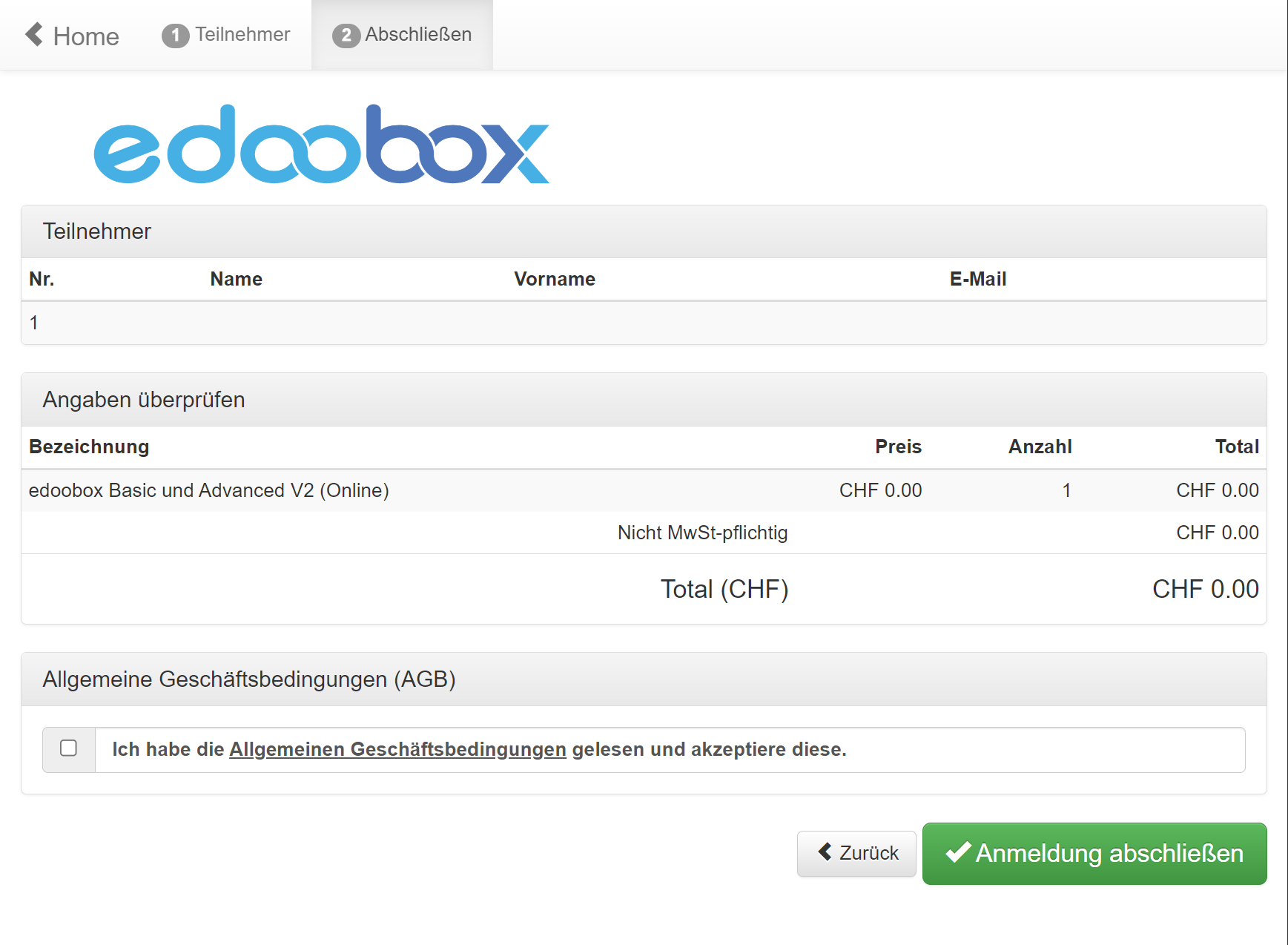 Das Anmeldeformular und die Abschlussseite im Buchungsprozess mit edoobox