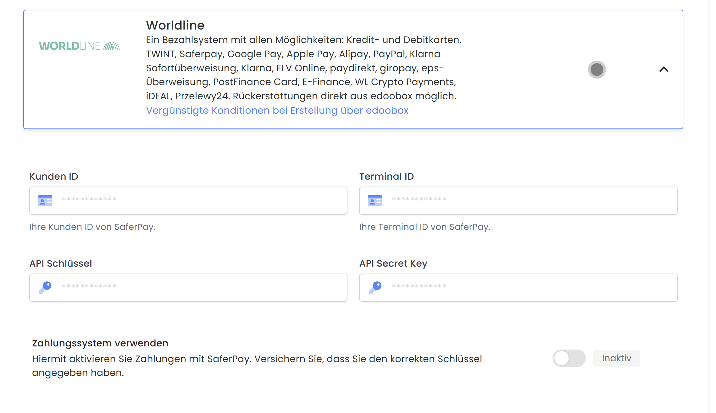 Worldline ist sehr einfach in edoobox zu implementieren. Verwenden Sie die Worldline-KontoID oder falls Sie Worldline-Business anstelle E-Commerce verwenden, das erhaltene Passwort in edoobox.