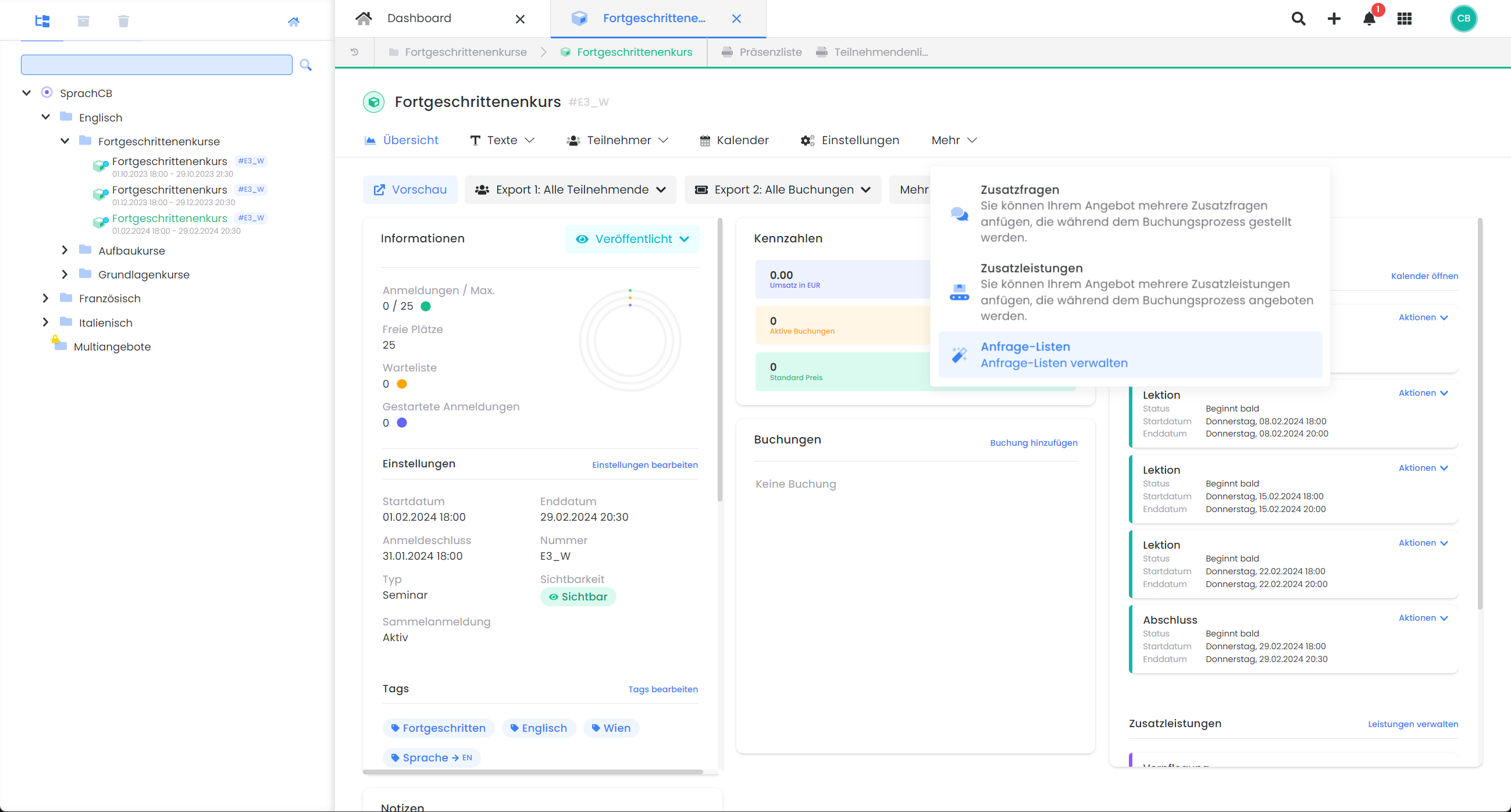 To view the bookings in a request list, click on the desired offer and navigate to the "Request lists" area via the "Participants" tab.