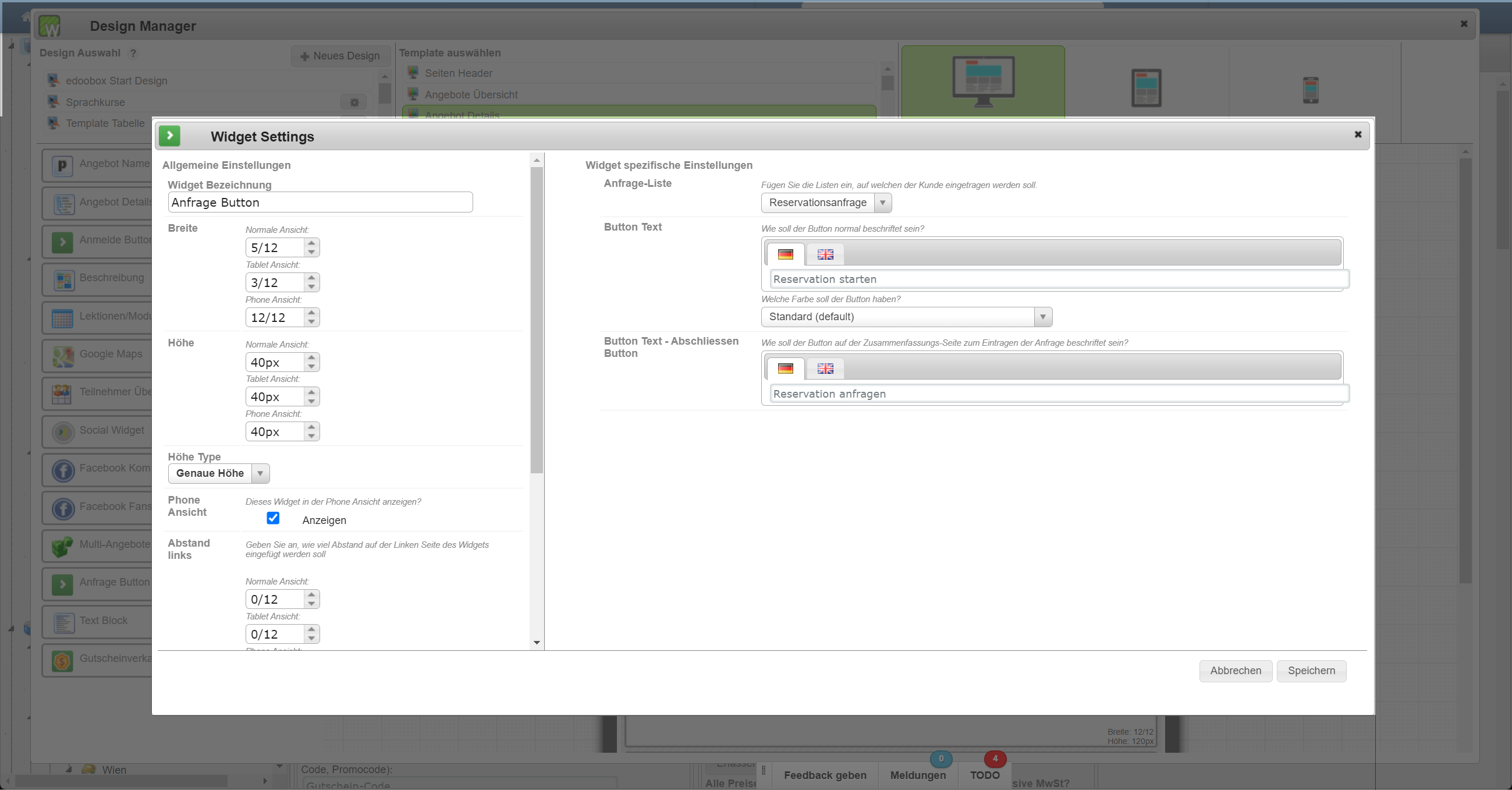 Customize the button names for the start and completion of the request in the booking process to your application example. You can also define the button color.