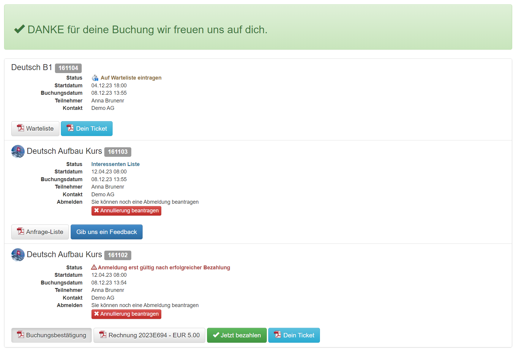 The status of a participant request can only be set once. If the status is selected incorrectly, the request can be deleted and added again. If a participant has been confirmed incorrectly, the booking can also be deleted from the offer.