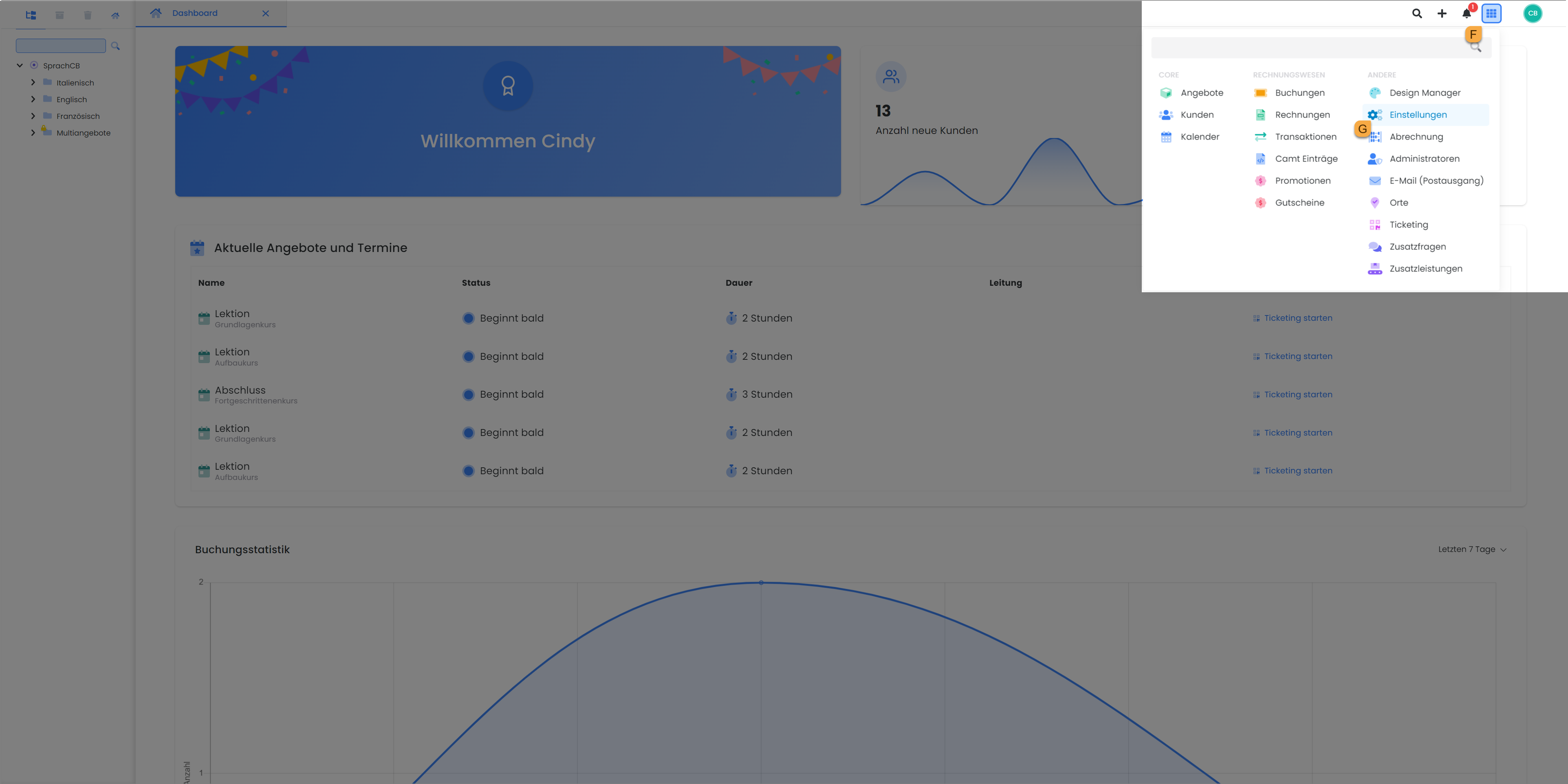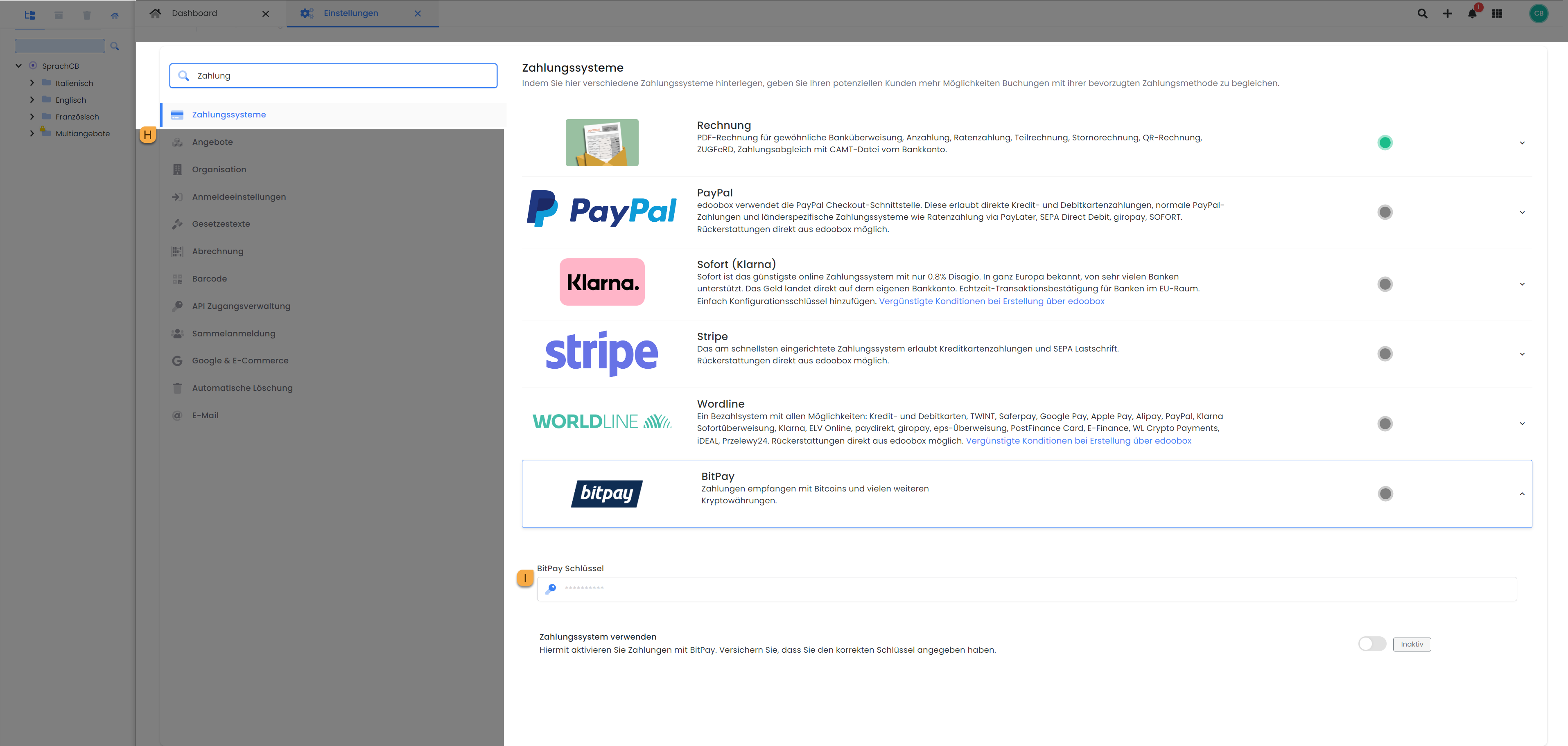 Copy the generated token from BitPay and save it in your edoobox account. To do this, log in to your edoobox account and navigate via the app menu F to the settings G. In the search option, search for "Payment systems" H. Click on "bitpay" to open the corresponding settings. Insert the previously generated token into the corresponding "BitPay key" field I, this will be saved automatically.