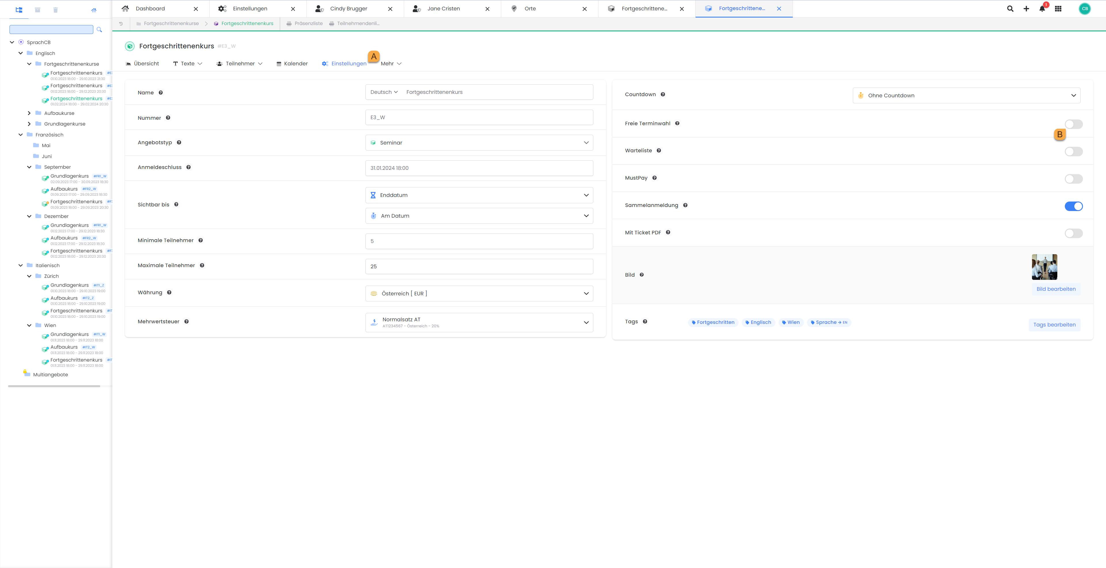 With the free choice of datesregistration type, all lessons/modules of an offer have the same price and the same maximum number of participants.