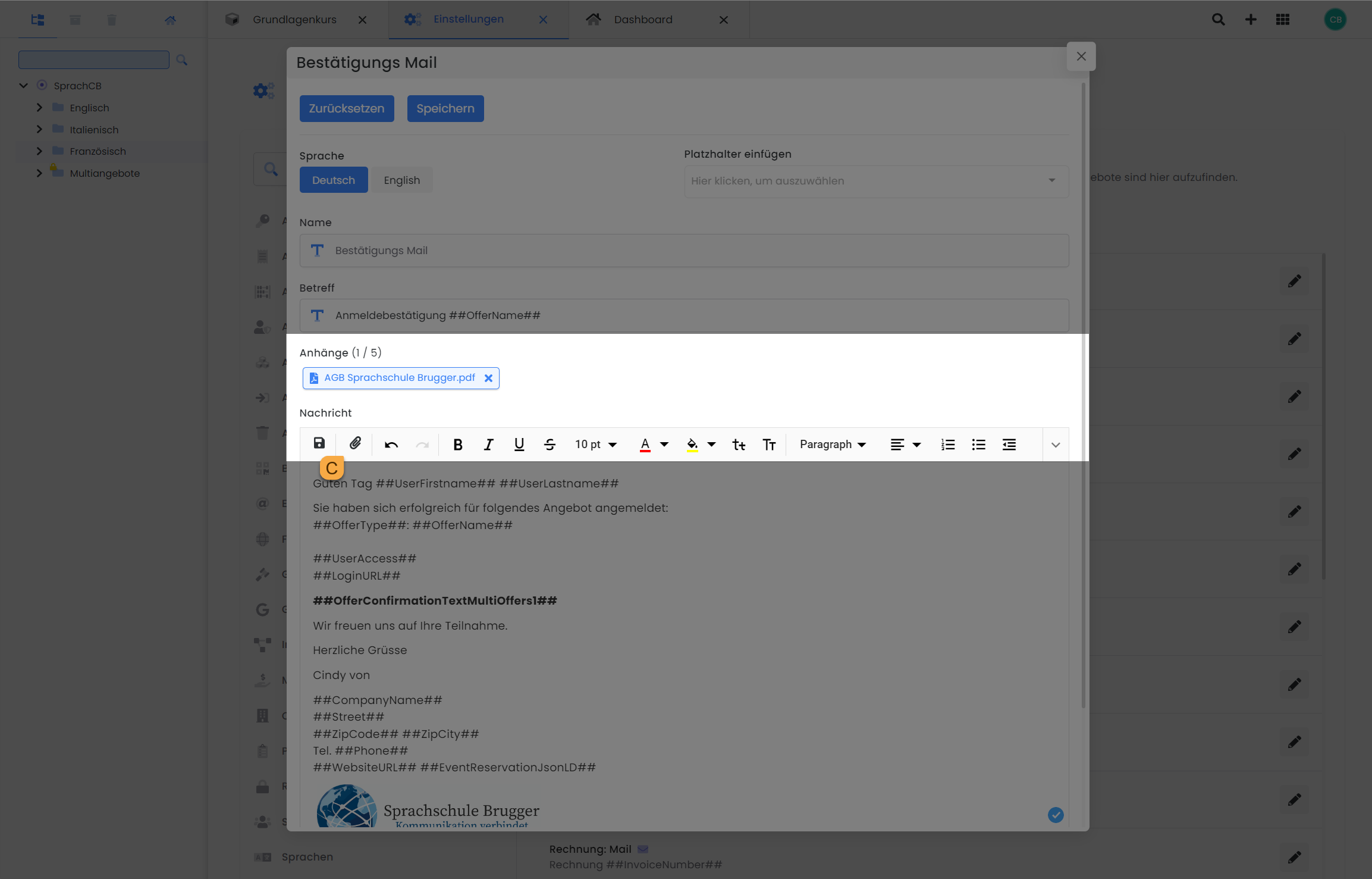 A maximum of 5 PDFs can be attached per e-mail template and per language.
