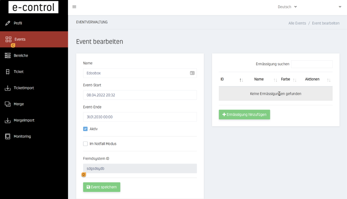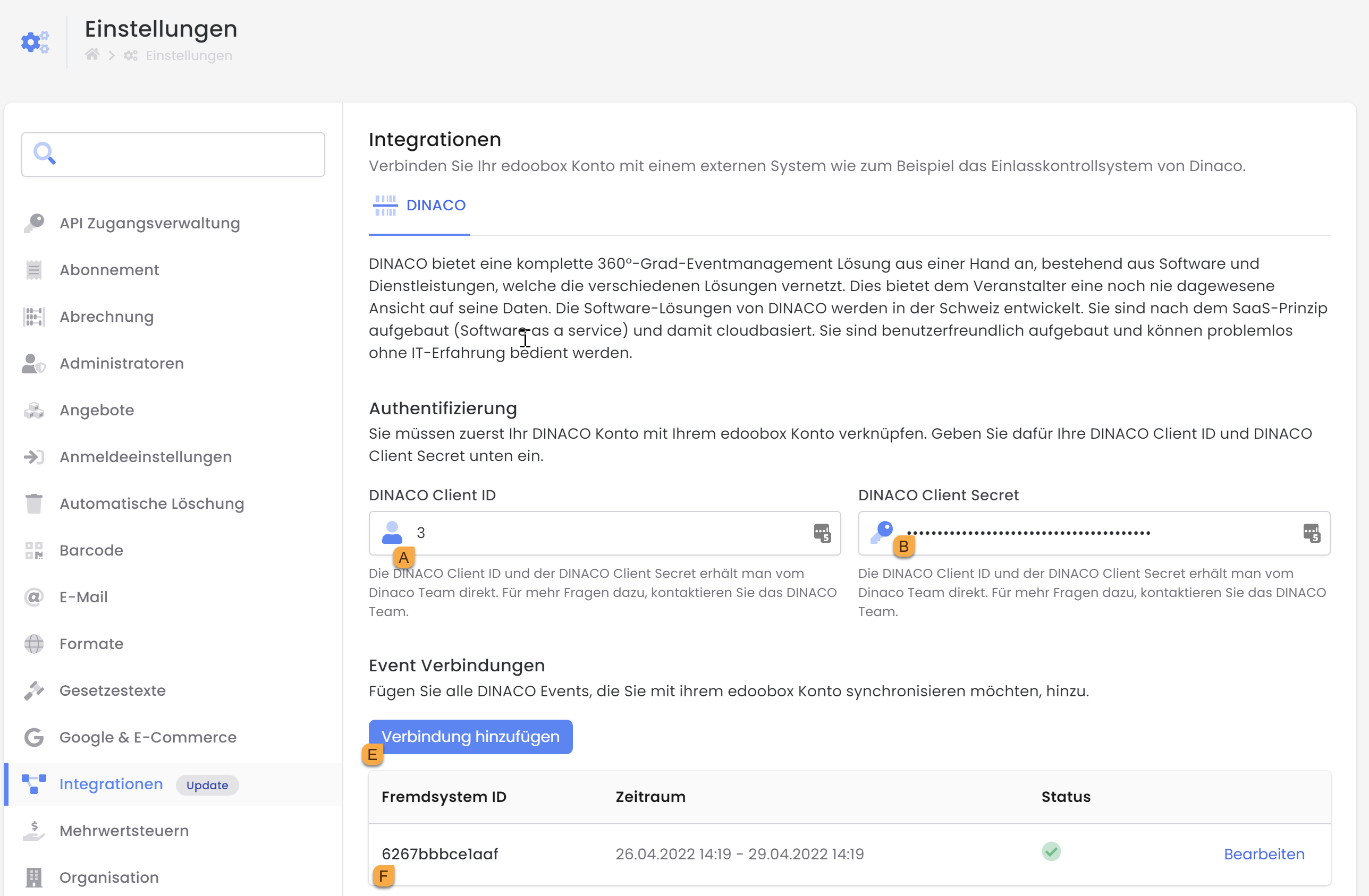Create a new event connection E in the edoobox account under Settings > Integrations > DINACO (Fig. 1). The external system ID F (Fig. 1) must correspond exactly to the external system ID that you have copied under Dinaco "Events"!