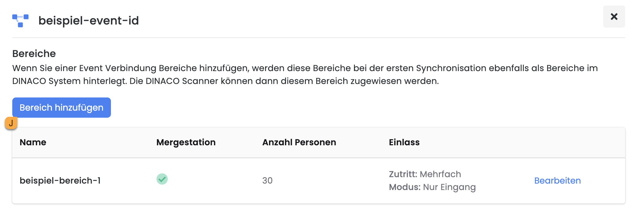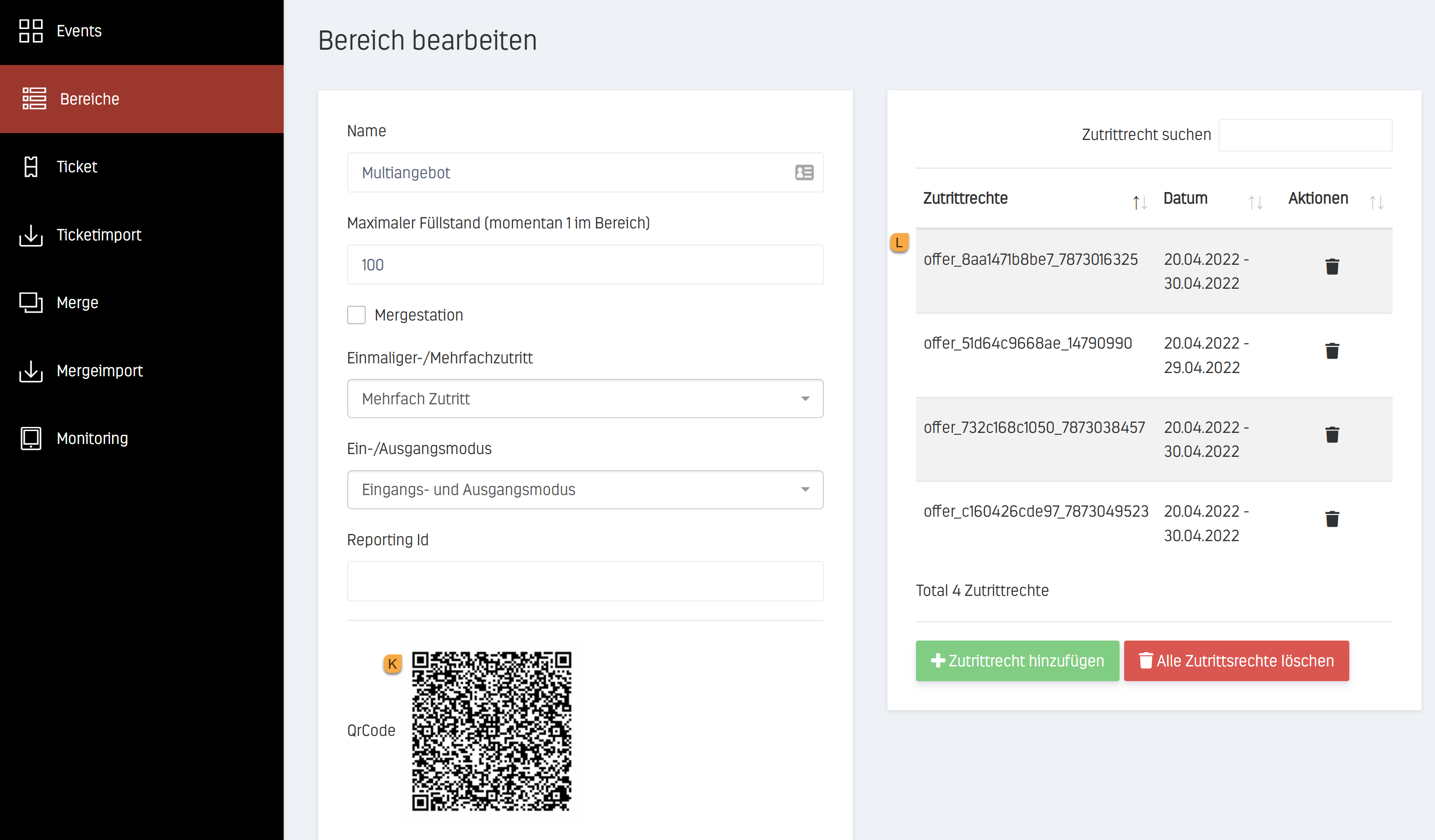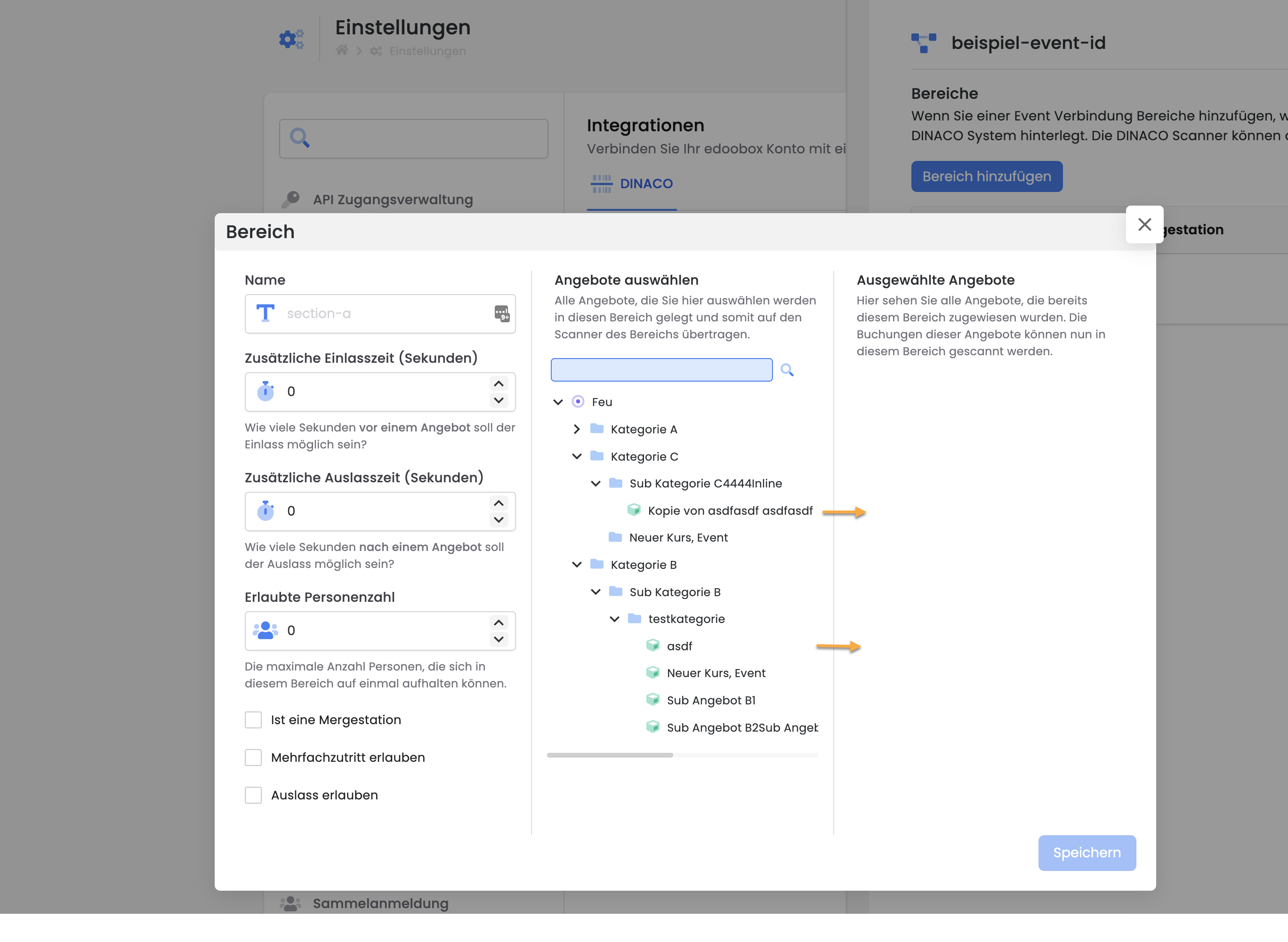 By clicking on "Areas" I, various offers can be linked per event (define areas/checkpoints).