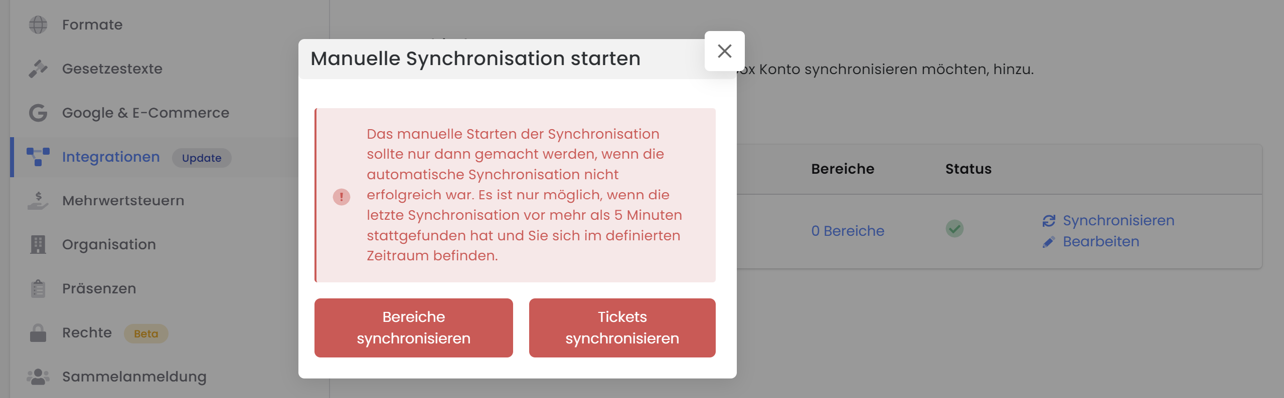 Select whether you want to synchronize the areas (possible every 10 minutes)