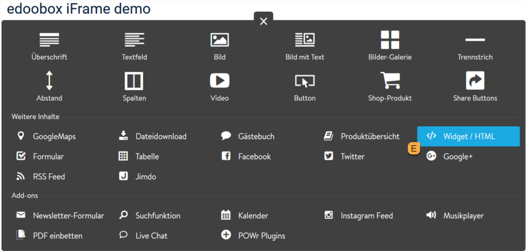 Click on "Add content" again below the title, then on "More content and add-ons "D and select the widget "Widget / HTML "E.
