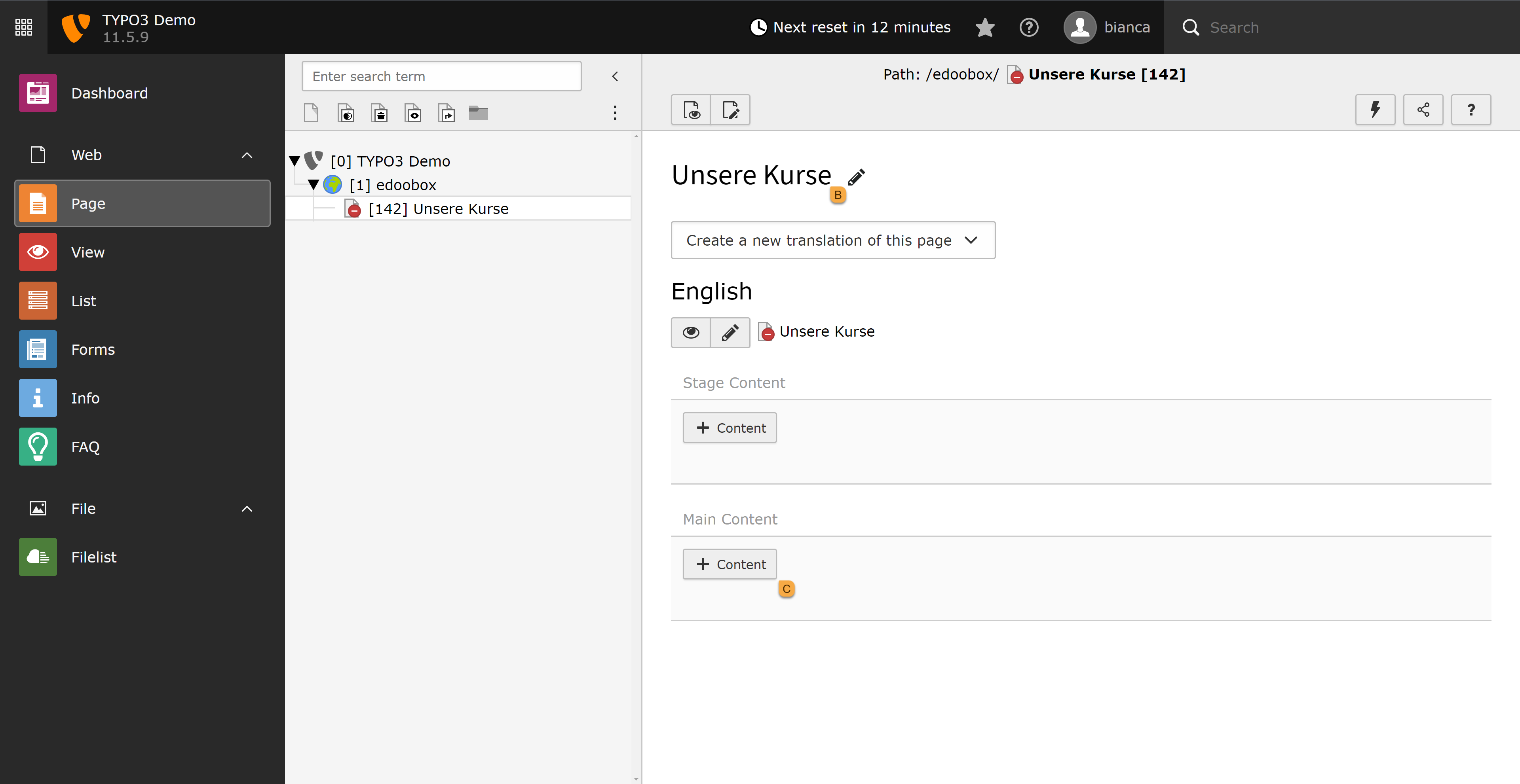 2. enter a page title e.g. OurcoursesB and click on C Content under Main Content.