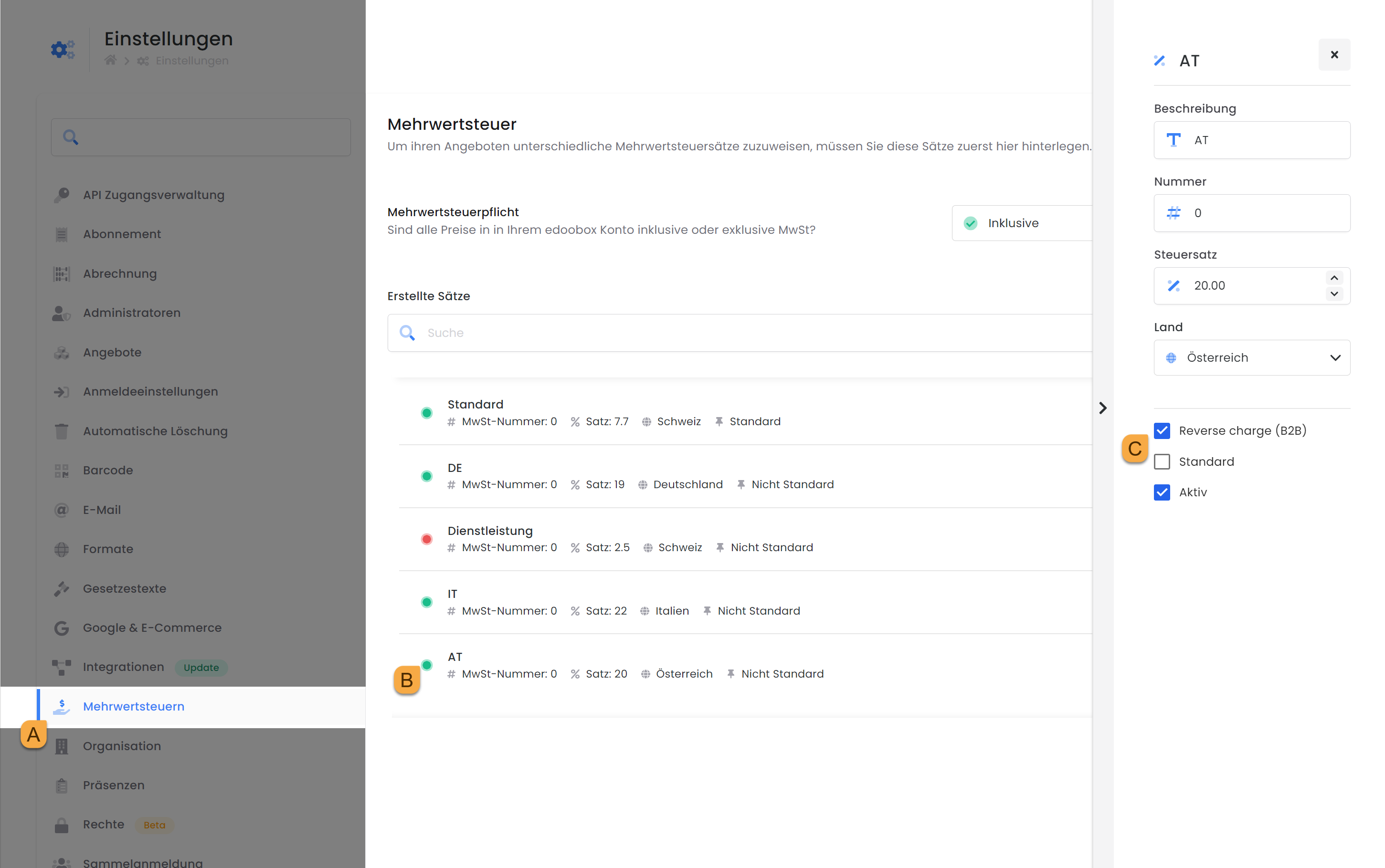 Reverse charge is activated in the V2 in the settings in the "VAT" tab A. Click on the desired VAT rate B for which reverse charge is to be activated and check the box "Reverse charge (B2B)" C.
