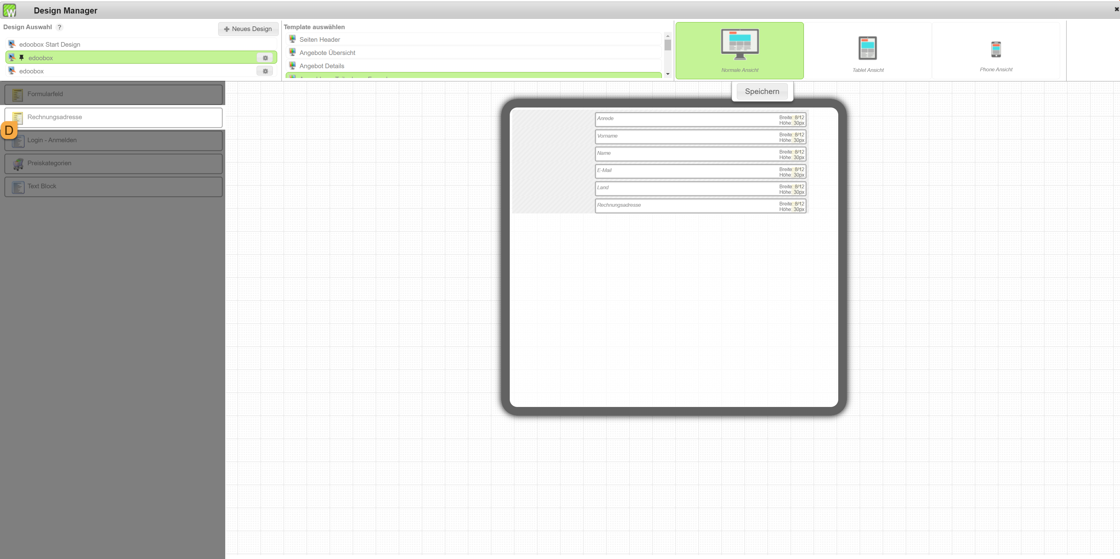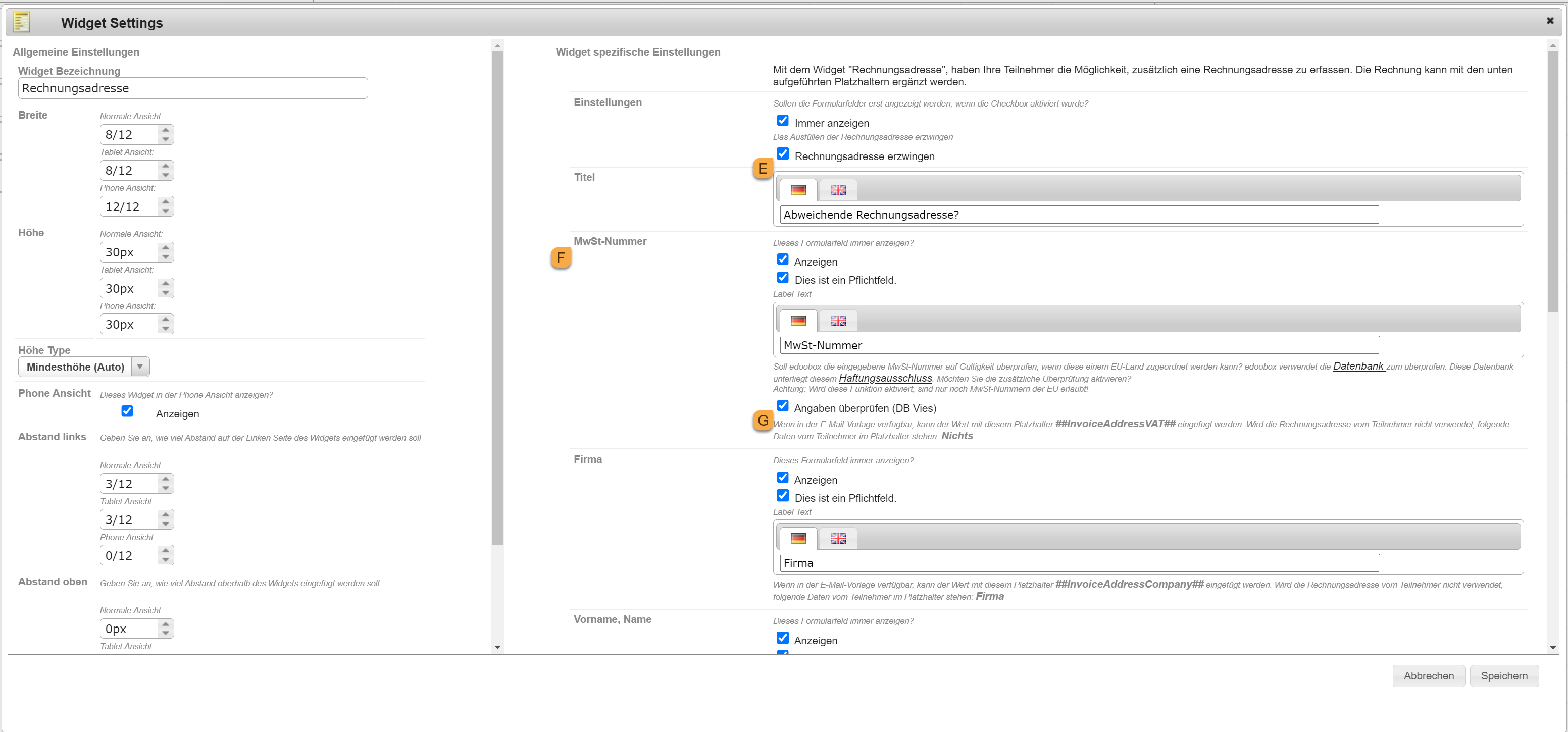 As soon as reverse charge has been activated in the desired VAT rate, the "Billing address" widget D must also be added to the participant form in the Design Manager. The widget must be added as the VAT number is requested in it.