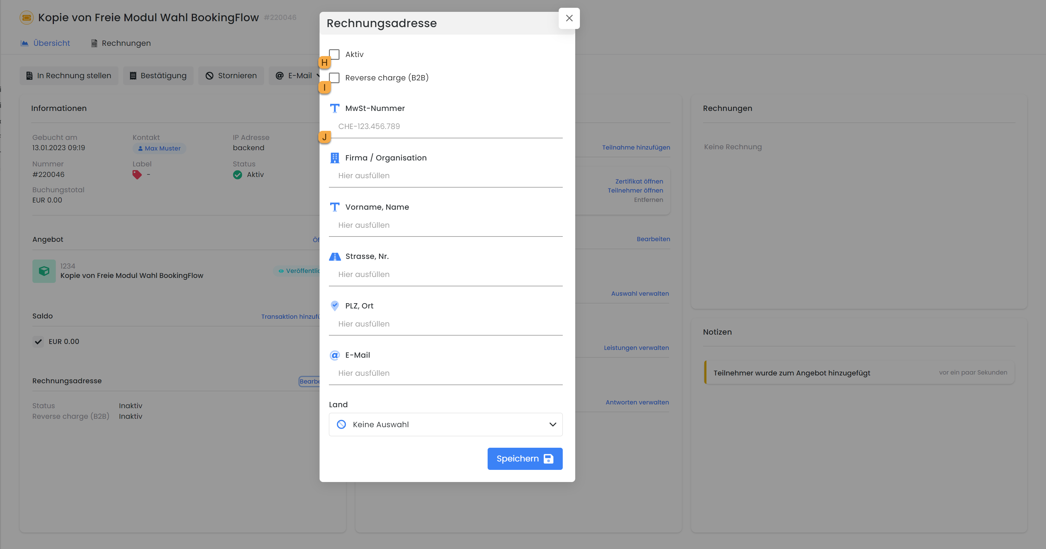 It is possible to subsequently activate or deactivate reverse charge in an existing booking in the backend. Navigate to the billing address in a booking and click on "Edit". If the reverse charge option is to be added to a booking retrospectively, the billing address must be activated, a check mark must be placed next to "Reverse charge (B2b)" I and a valid VAT number J must be added. If reverse charge is to be deactivated, only the check mark can be removed again.
