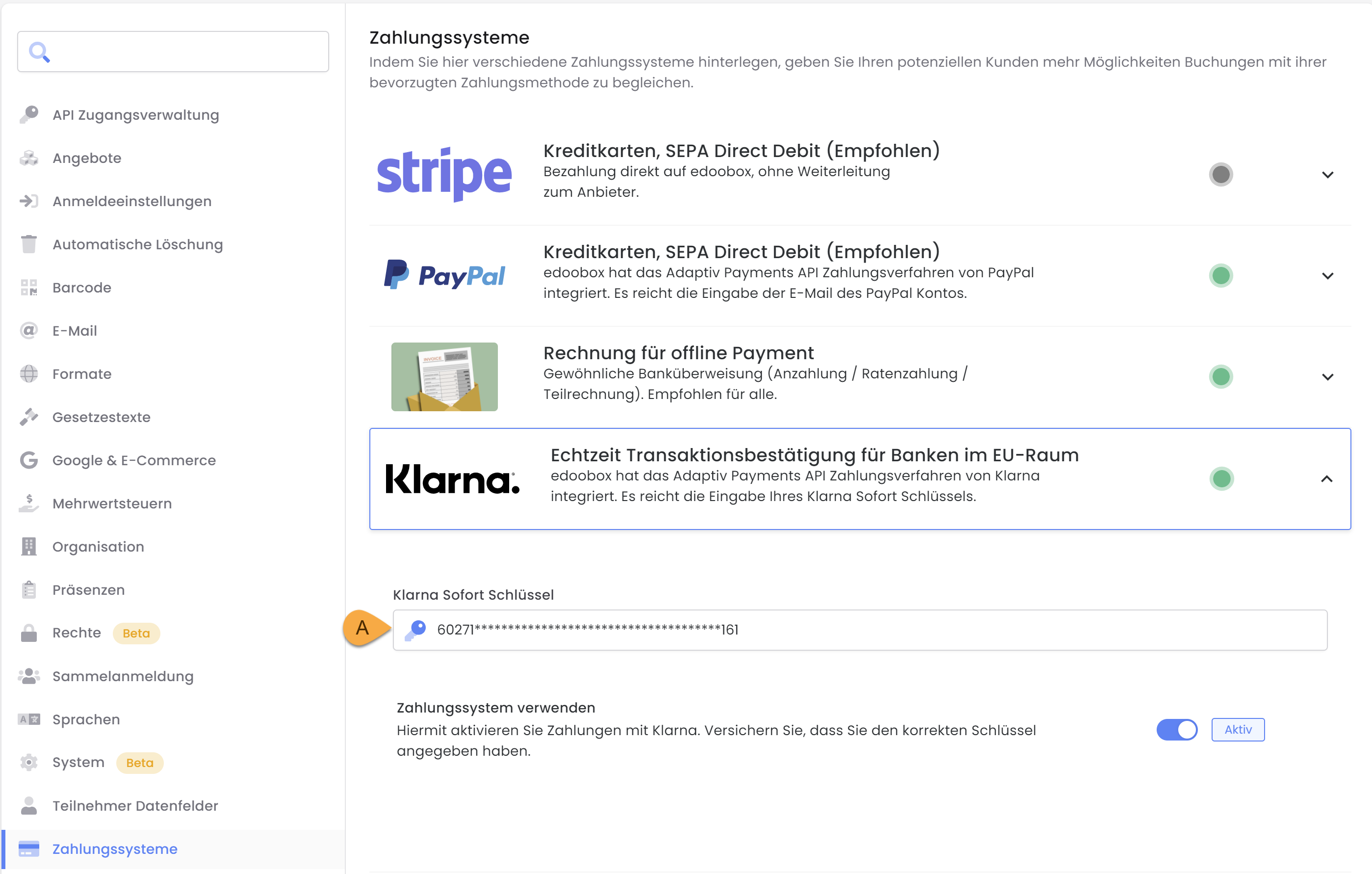 Copy the unique configuration key A in your newly created project. Add this to the edoobox "Settings" under "Payment systems "Klarna" and activate this payment system.