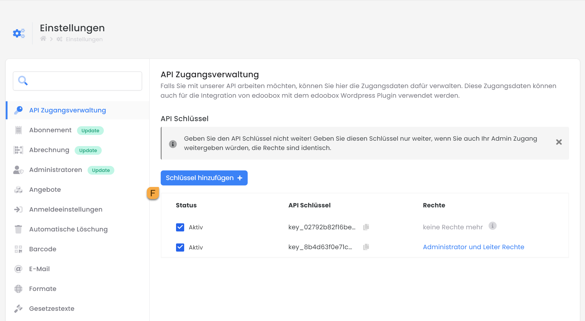 You can find the "API access management" in the edoobox settings in your edoobox account V2. The API keys can be created here. Click on "Add key" F and select the Zapier right under Rights. After clicking on "Add", a public and a secret key are displayed in a window. Copy both keys to the clipboard and save them in a safe place. The secret key is only displayed once! You can find more information on this under edoobox API.
