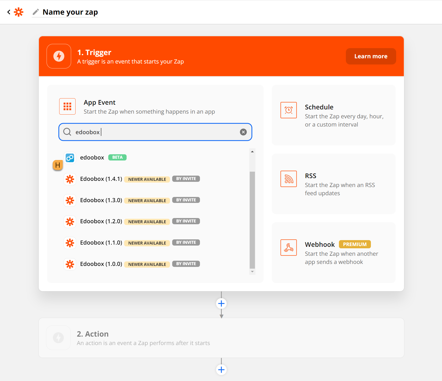 Via "Create Zap" you can go directly to the first trigger, for which you now select the edoobox App H.