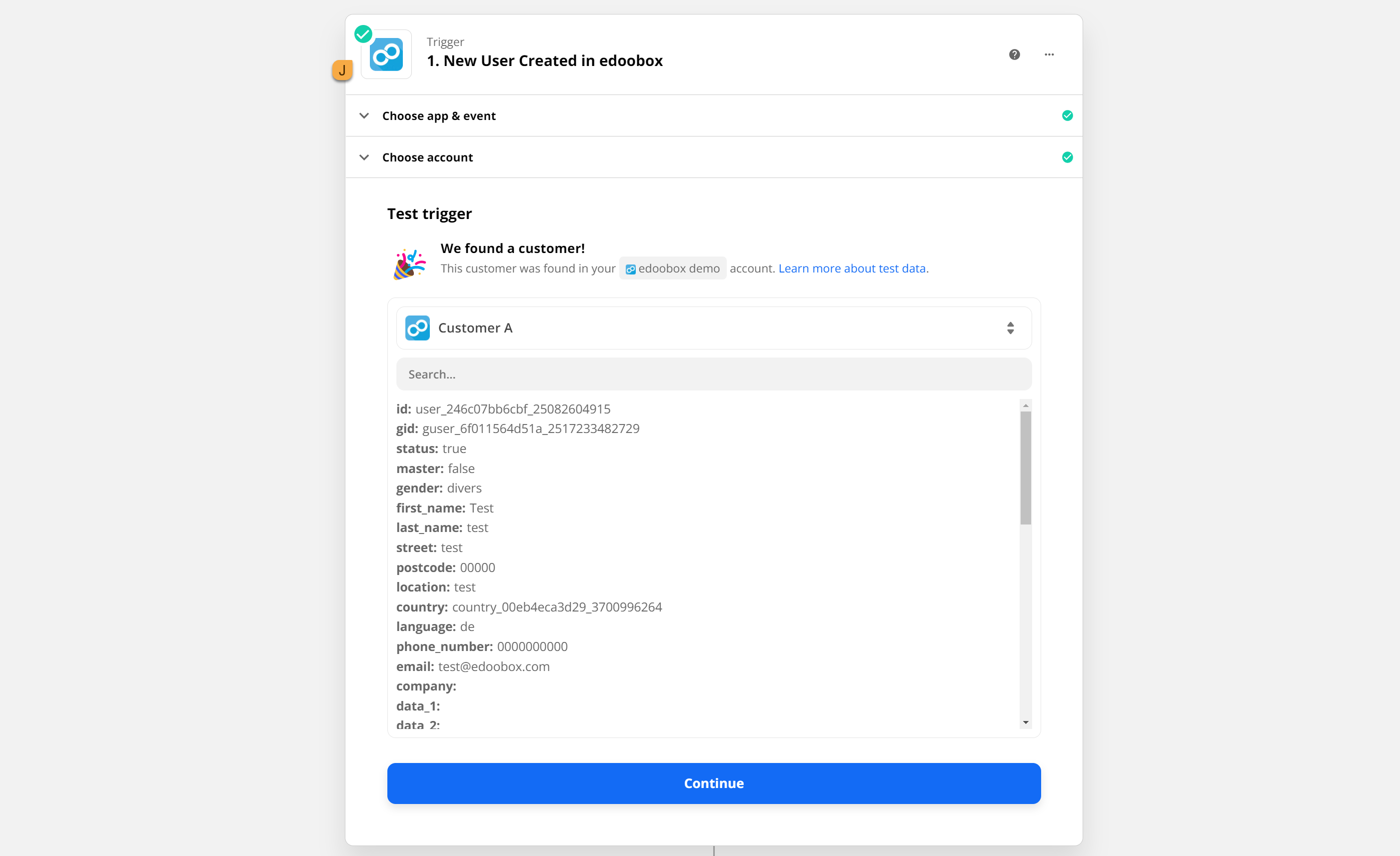 As the last step of the first trigger, select the edoobox account that you have previously connected. The connection can be checked again at this point; if it is successful, the trigger receives a J tick to confirm the connection.