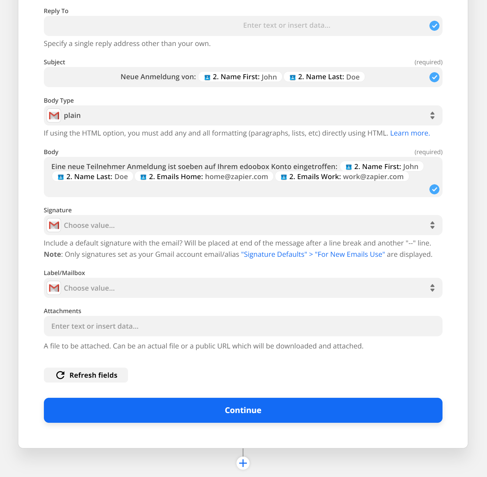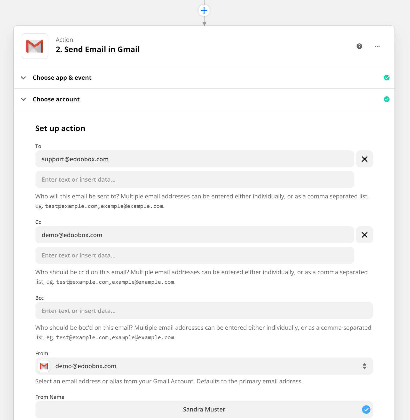 After you have linked your edoobox account, you can test the connection G. After a successful test, you can start recording the first Zap.
